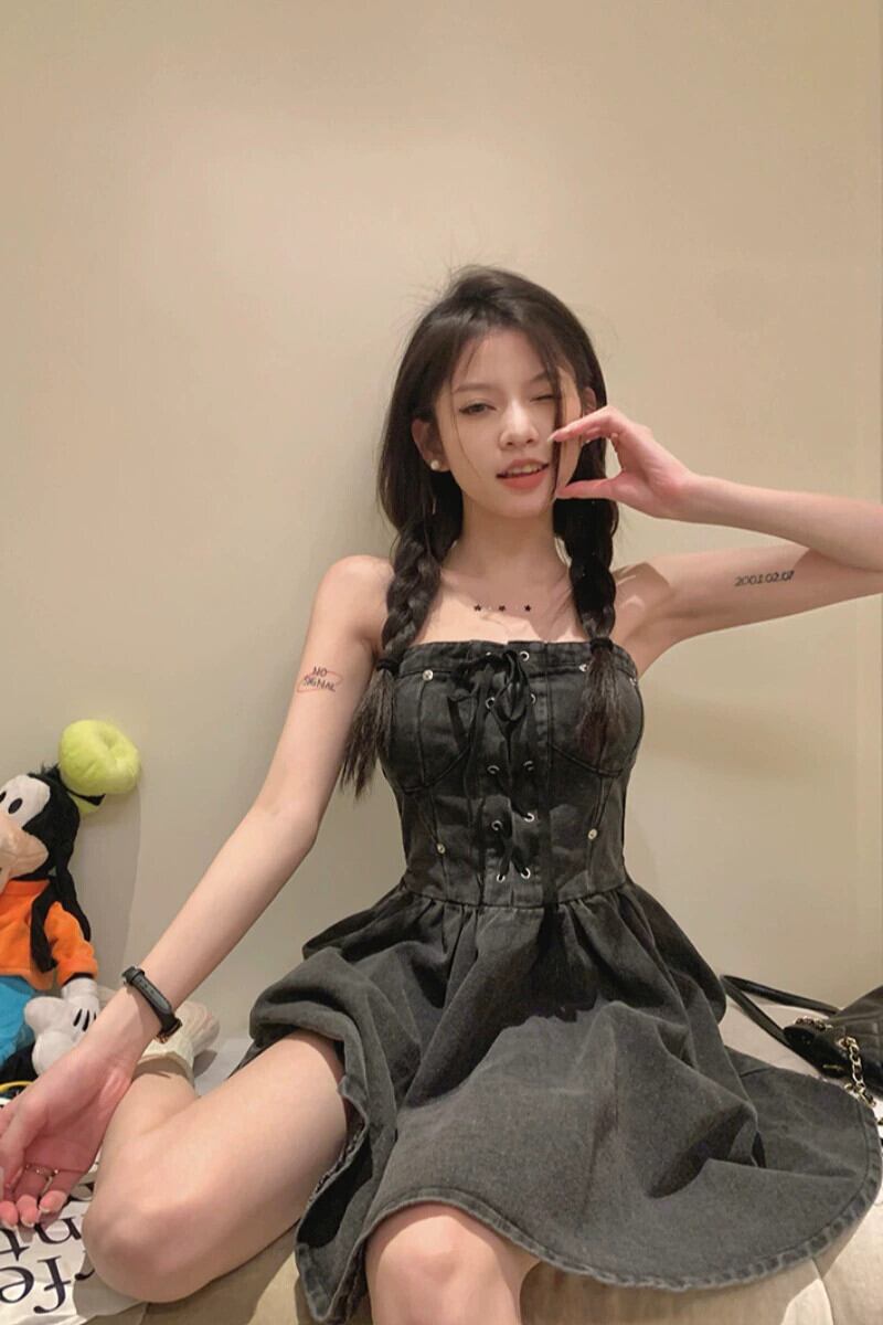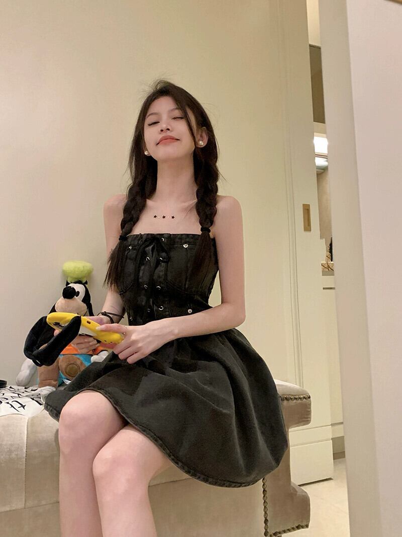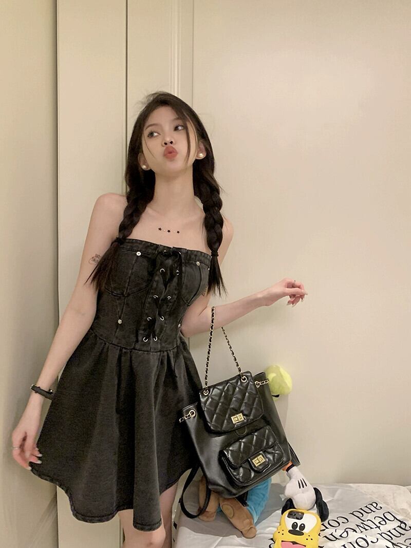 古い洗浄されたレトロなスタイルのチューブトップドレス女性の夏 2023 新しいストラップウエスト痩身デニムスカート サマー 夏物 092193468394305