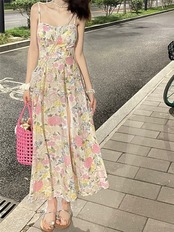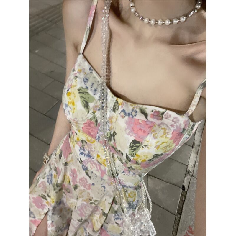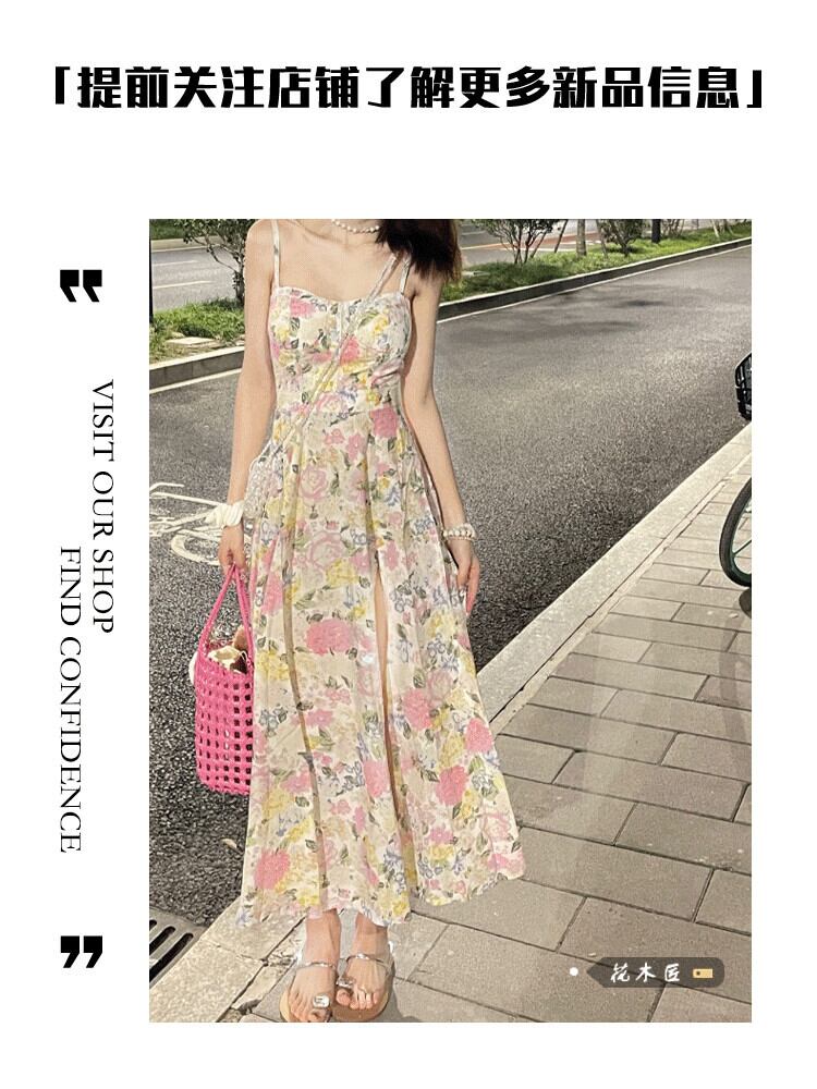 フレンチレトロスリット花柄スリングドレス女性の夏の 2023 新しい純粋な欲望風スリムスリムミッドレングススカート サマー 夏物 ピュア 0921941062068394