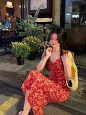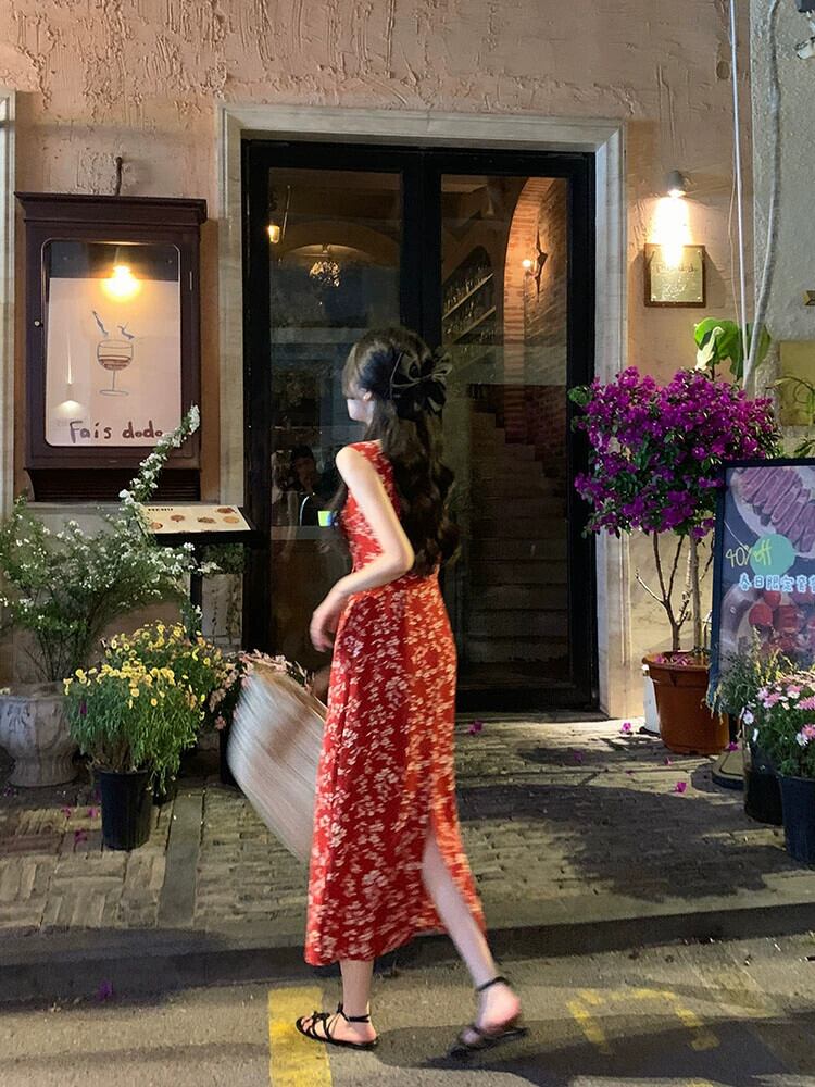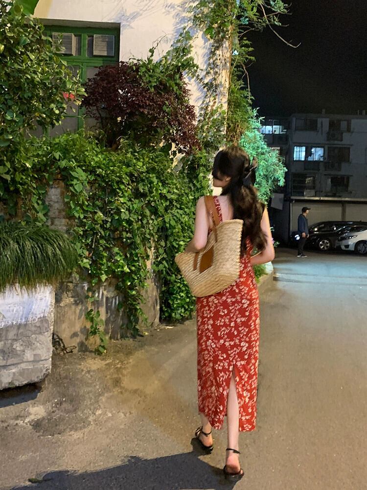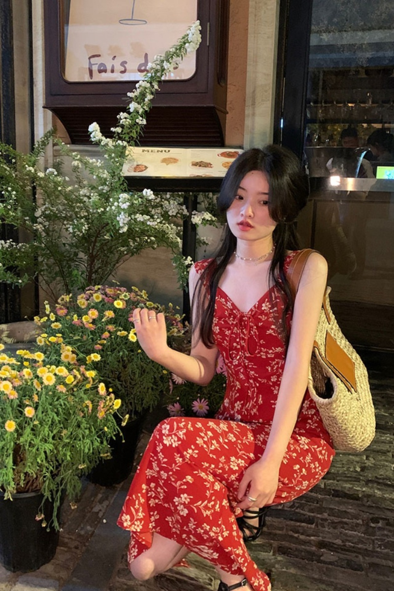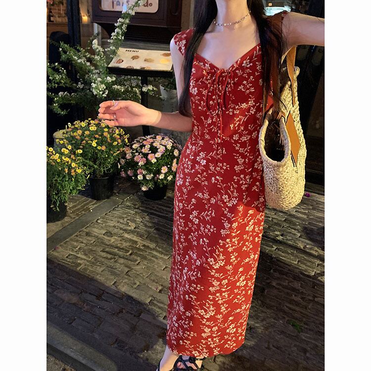 フレンチロマンチックな花柄 V ネックベストドレス女性の夏の 2023 新しいセクシーなスリムスリムミッドレングススカート潮 サマー 夏物 Vネック 0921971064006685