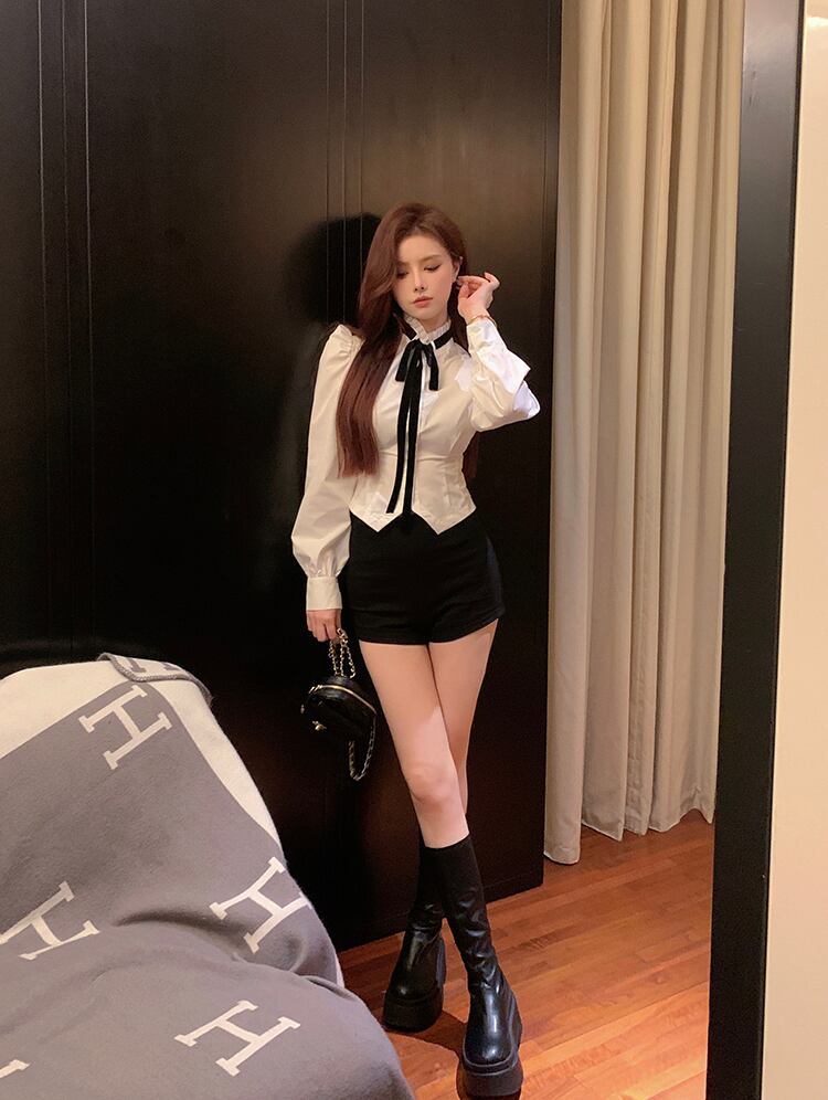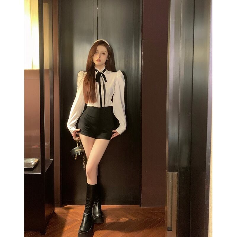 白いスタンドカラー木耳長袖シャツ女性の春と秋のシックなインナーウエスト痩身スリムシャツトップ ロング ホワイト スプリング 春物 オータム 秋物 0921924296567608