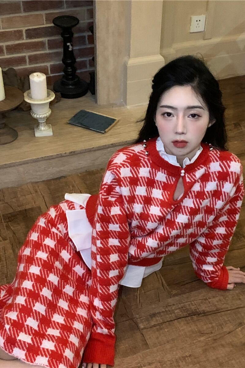 レトロクリスマスフェイクツーピース長袖チェック柄ニットセータースーツスカート女性の春と秋の不規則なスカートツーピースセット ロング スプリング 春物 オータム 秋物 0921990481483144
