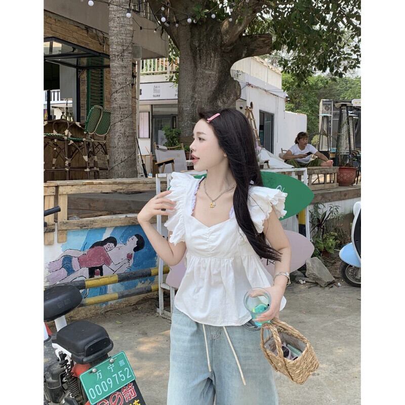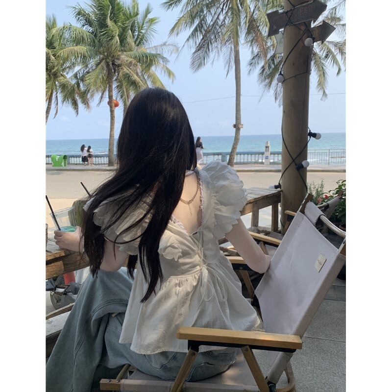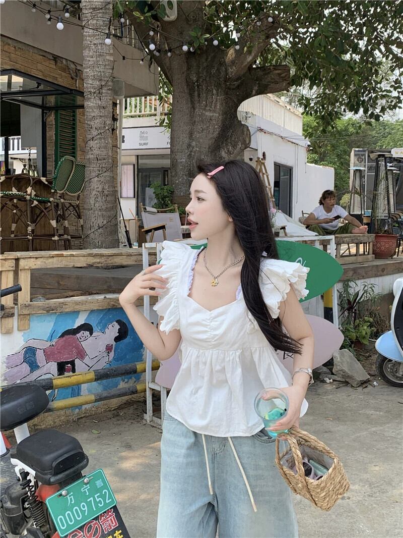 甘いスタイルの白いフライング スリーブ シャツ レディース 2023 夏の新しいバック タイ ショート セクション スリム シャツ ホワイト 大人ガーリー スウィート キュート カジュアル サマー 夏物 092196084472048