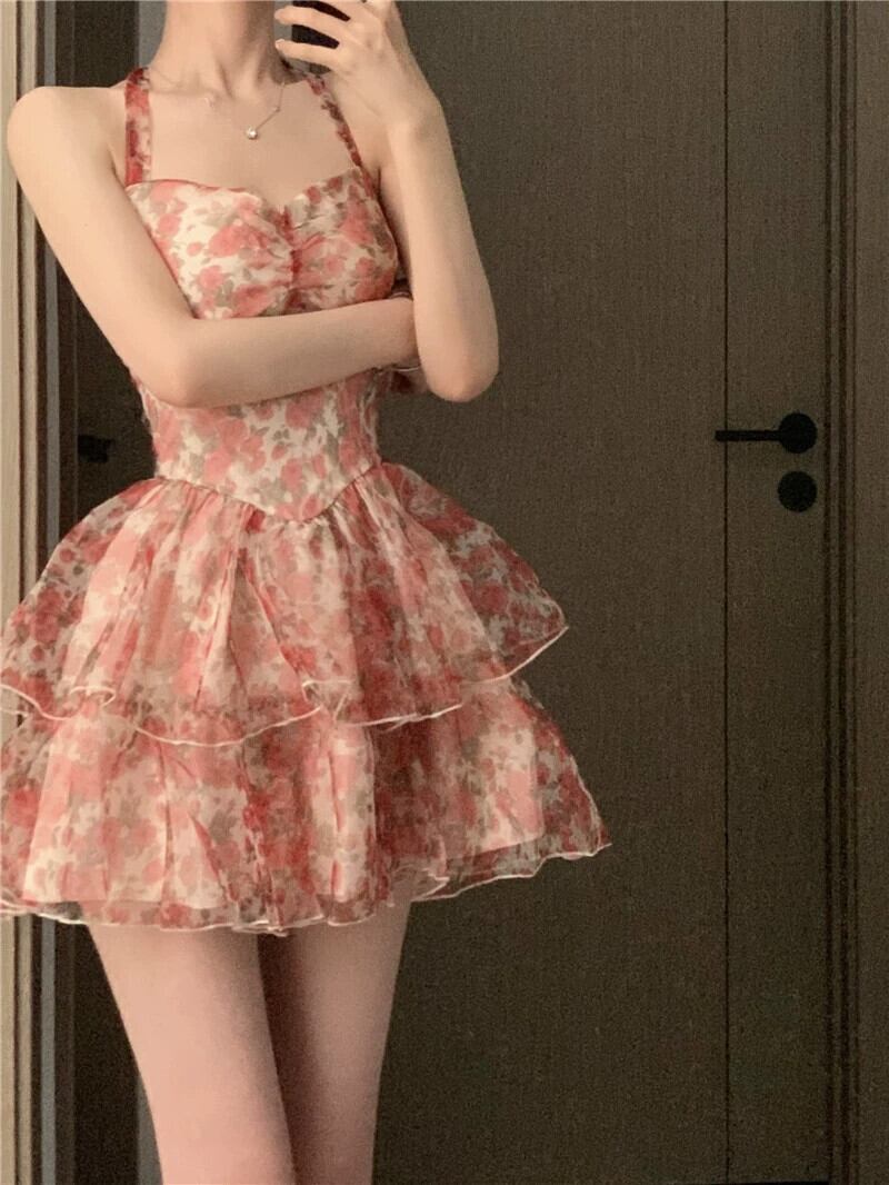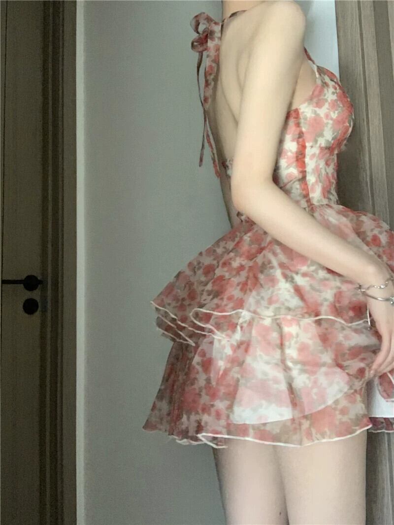 フレンチスイートスタイル花柄ハンギングネックドレス女性の夏の2023新しいウエストウエストスリムストラップケーキスカート潮 大人ガーリー スウィート キュート カジュアル サマー 夏物 0921944625240084