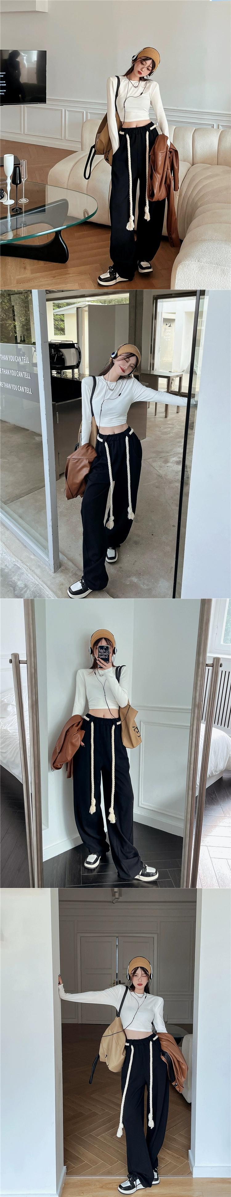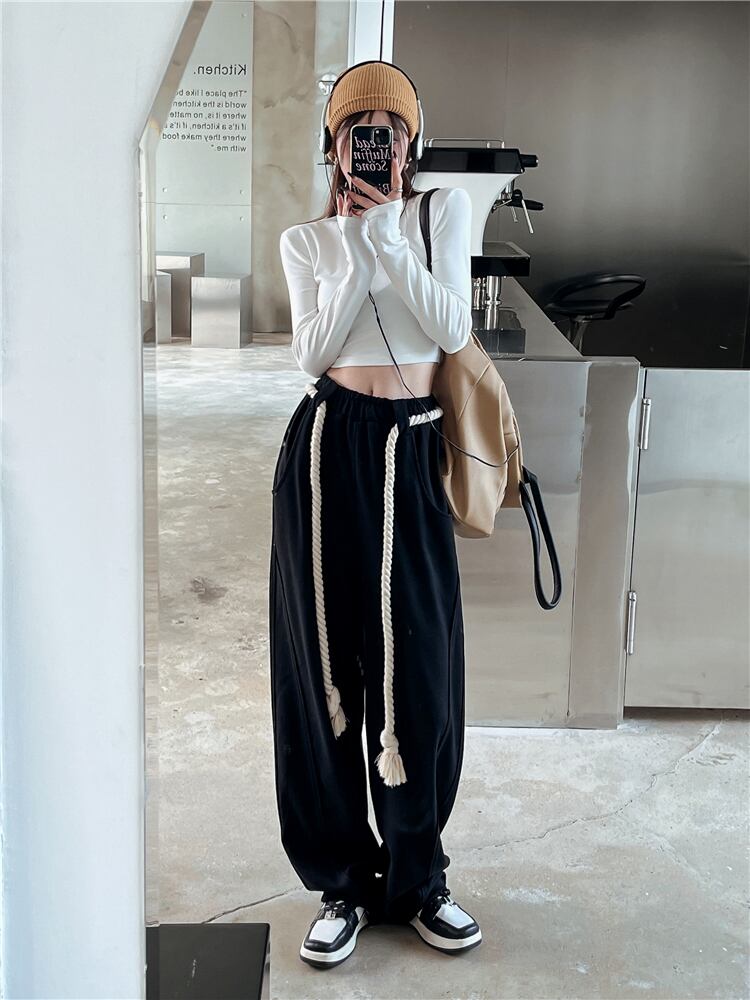 アメリカのストリートファッションスーツ女性 2023 春の新ストラップ長袖 Tシャツハイウエストモップパンツ 2 点セット ハイウェスト ロング スプリング 春物 0921961688855608