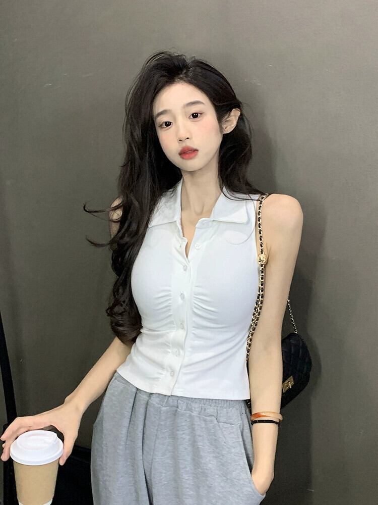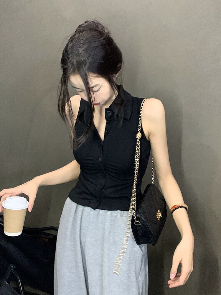 ソリッドカラーのオールマッチポロカラーノースリーブベストの女性の夏の2023新しいスリムフィットと薄い底カーディガントップのバージョン サマー 夏物 0921926847057967