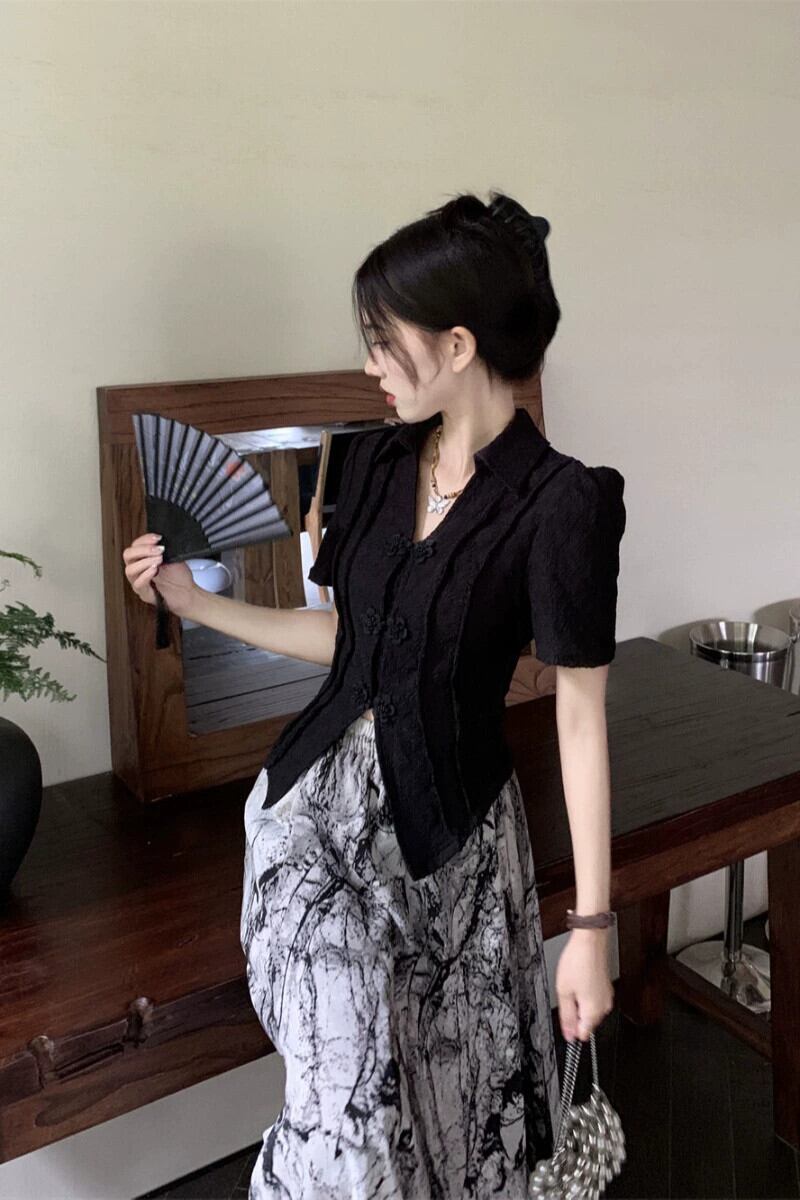 レトロバックルラペルバブル半袖シャツ女性の夏の 2023 新しい気質短いセクションスリムスリムシャツトレンディな ショート サマー 夏物 0921997682866004