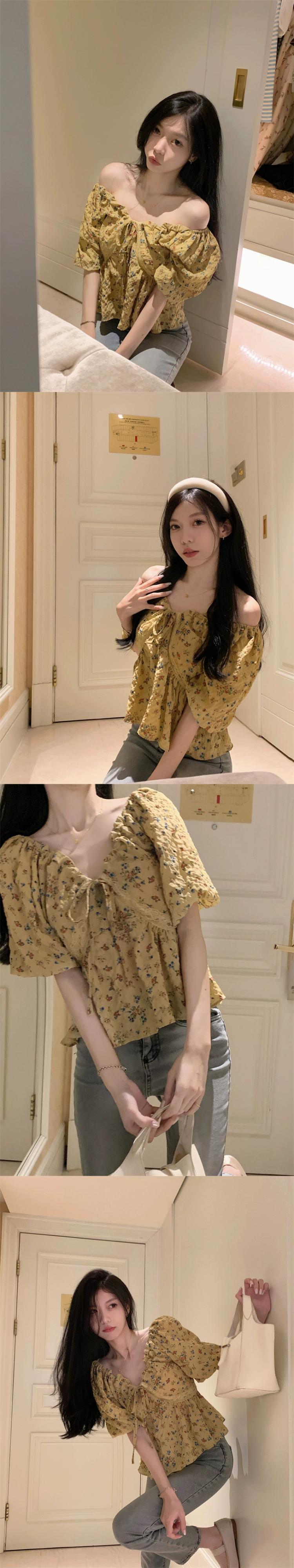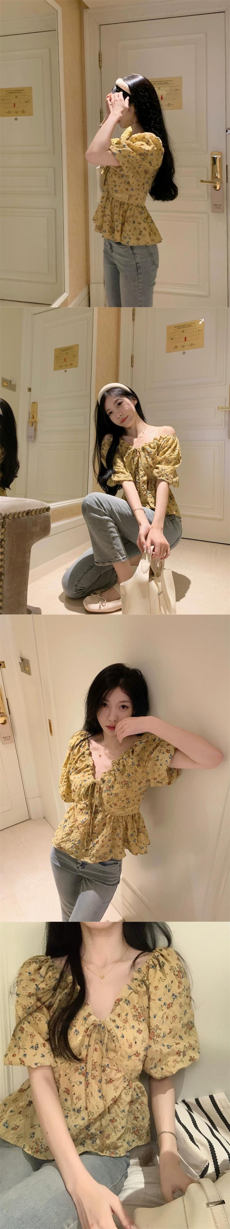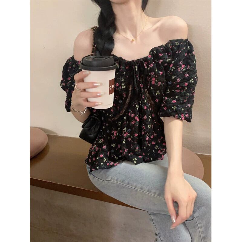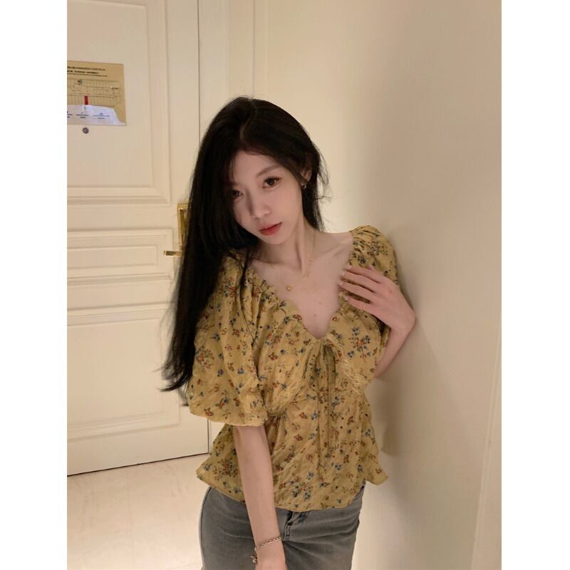 甘い花柄 V ネック半袖シャツ女性の 2023 夏の新作フレンチ レース パフ スリーブ ルーズ ショート トップ 大人ガーリー スウィート キュート カジュアル サマー 夏物 Vネック 0921994313710562