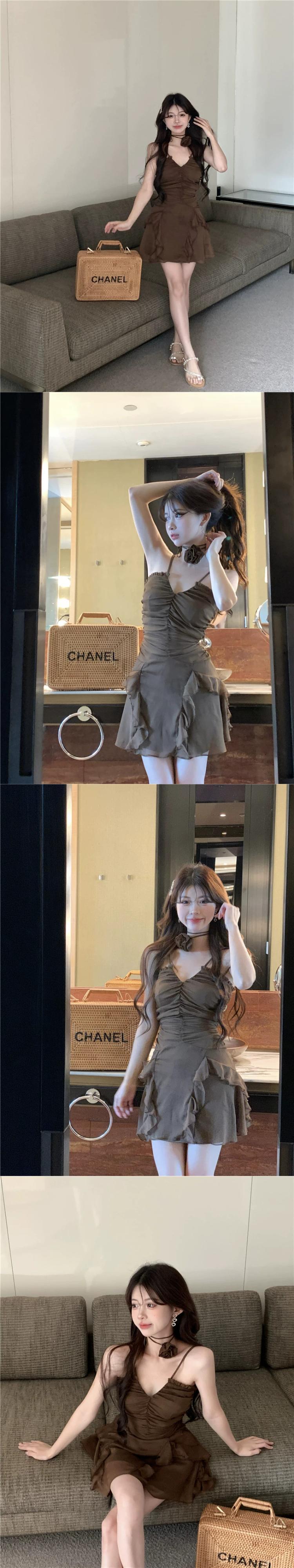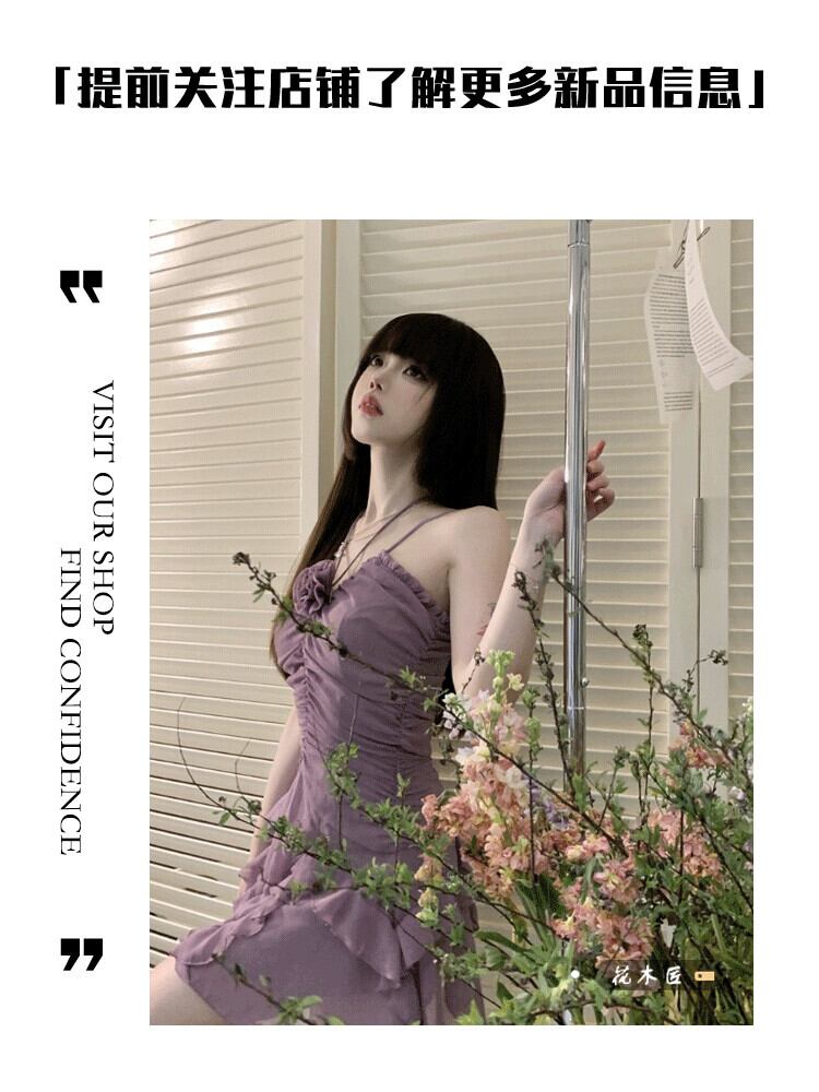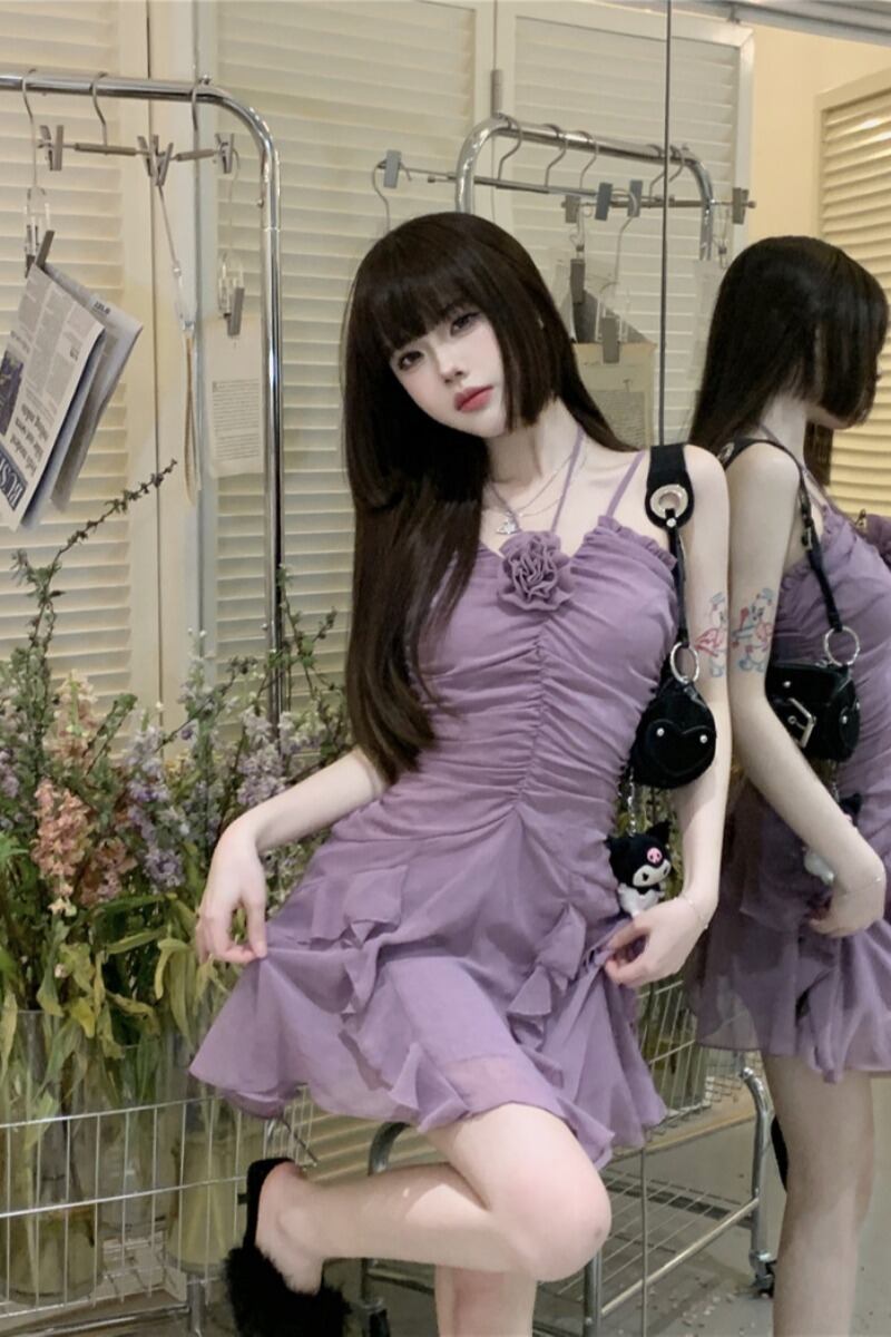 セクシーなパープルのホルターネックサスペンダードレス女性の夏のウエストショートスカート V ネックフリル A ラインスカート サマー 夏物 Vネック Aライン 0921918152762029