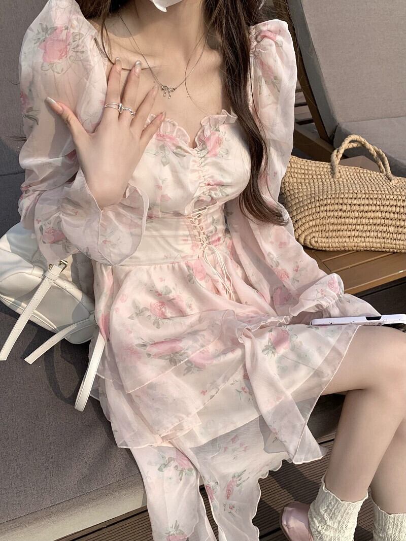優しい風フリルパフスリーブドレス女性の夏の 2023 新しいスタイルウエスト痩身不規則なスカート サマー 夏物 092196583064111