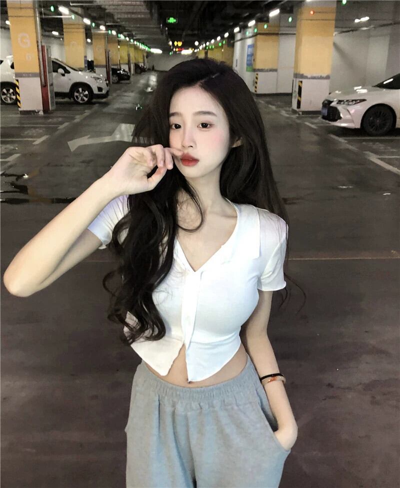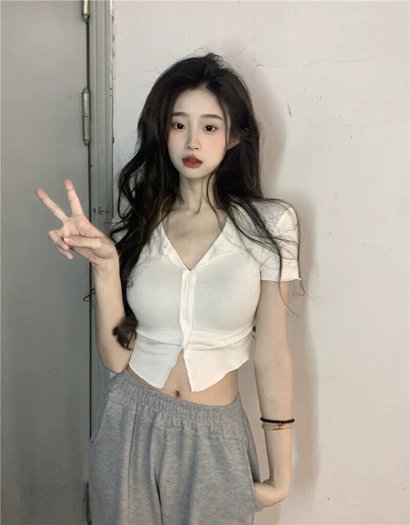 ホットブラック V ネック半袖 T シャツ女性の 2023 夏の新しいデザインの自己修養の感覚ショート スリム トップ サマー 夏物 Vネック Tシャツ 092197858490976