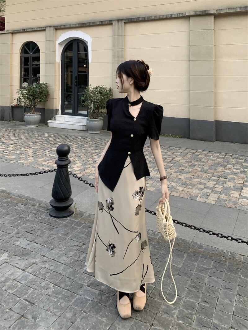 中国風のスーツスカートの女性の 2023 夏の新しいショートチャイナトップローズプリントスカート 2 点セット サマー 夏物 0921994903986324