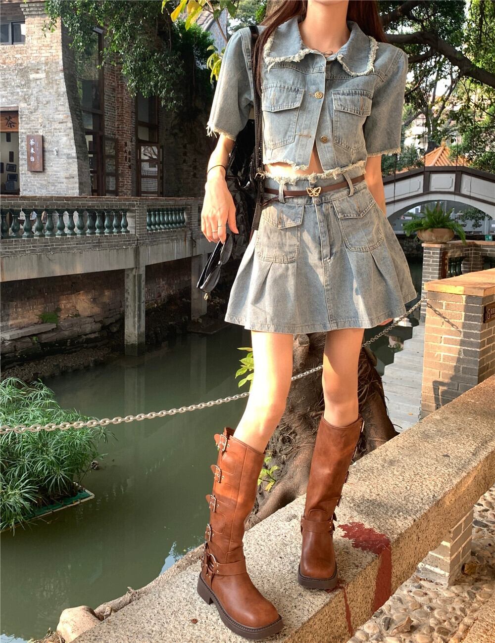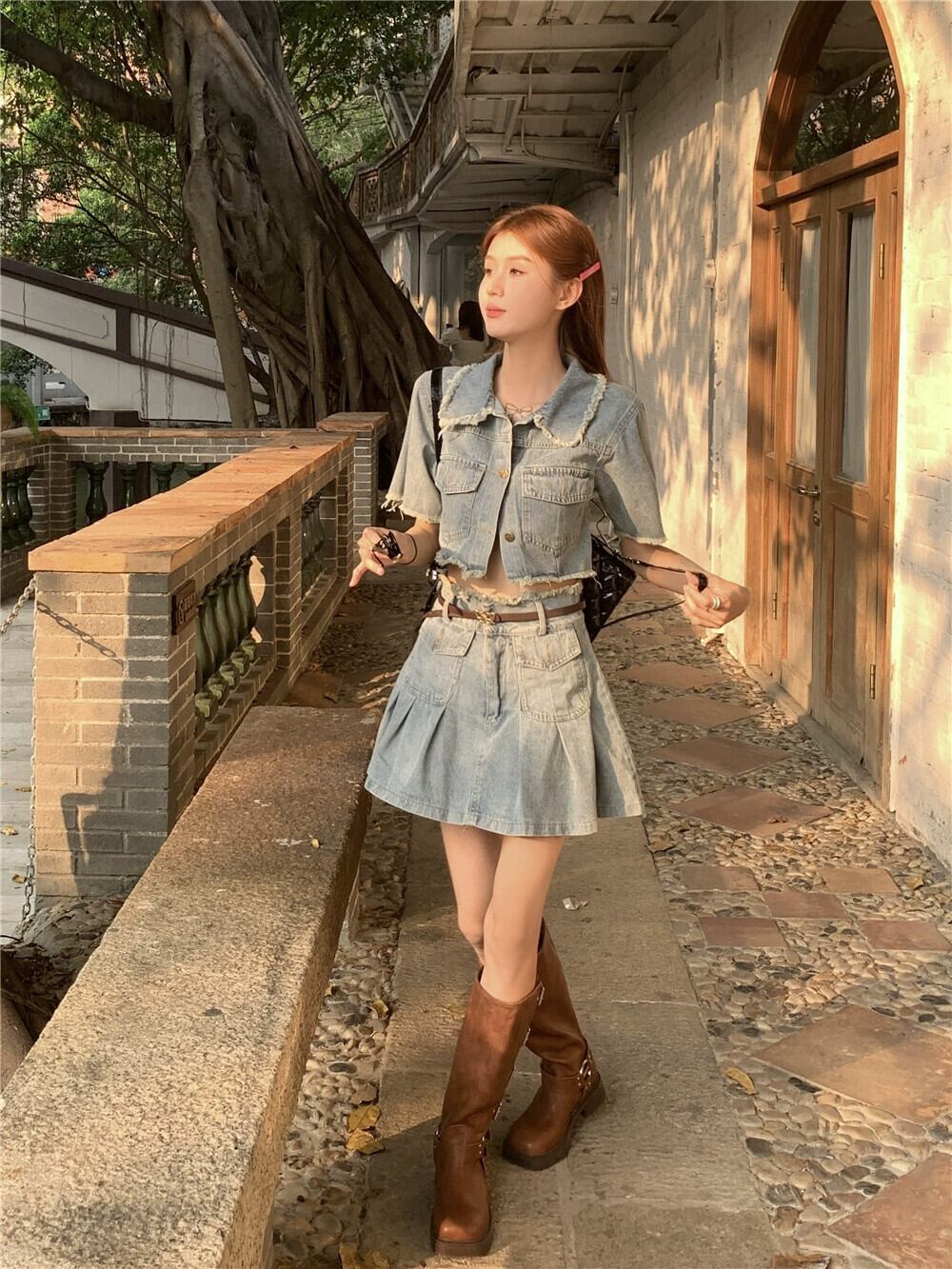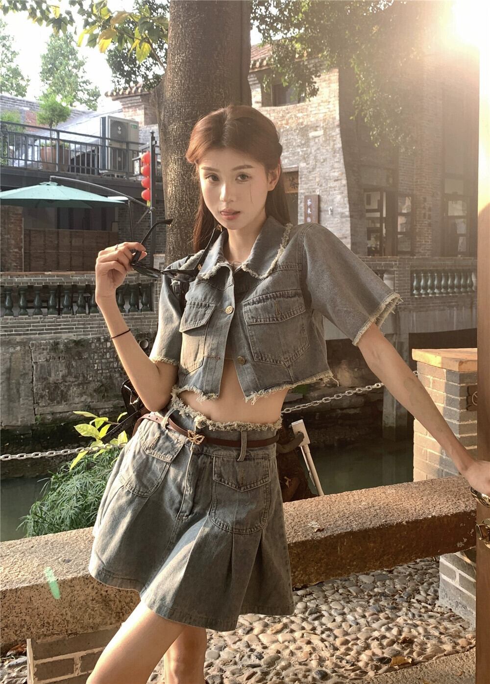 甘いクールなスタイルのファッションスーツ女性 2023 夏の新しいデニム半袖トップハイウエストスカート 2 点セット ハイウェスト 大人ガーリー スウィート キュート カジュアル サマー 夏物 0921943123134635