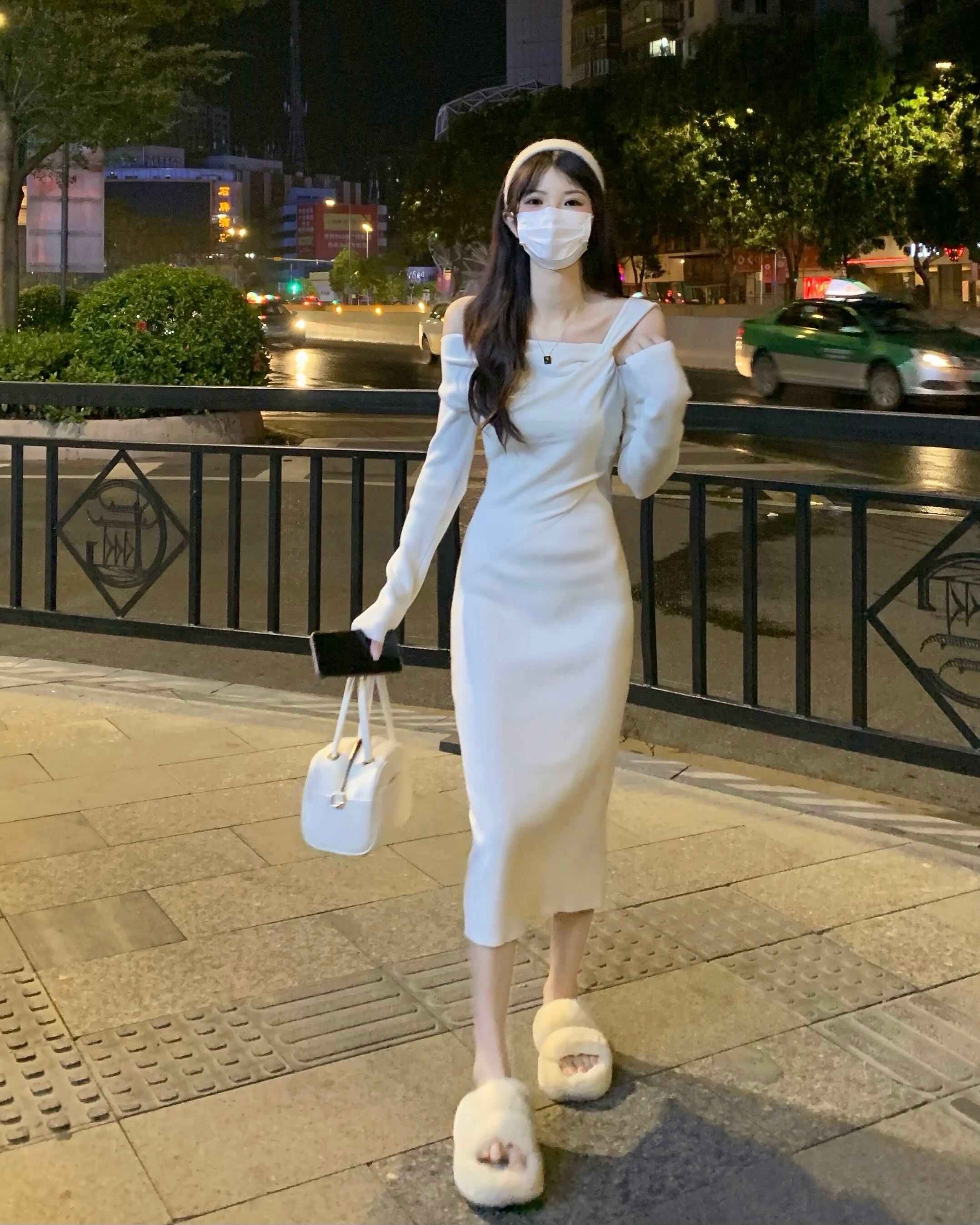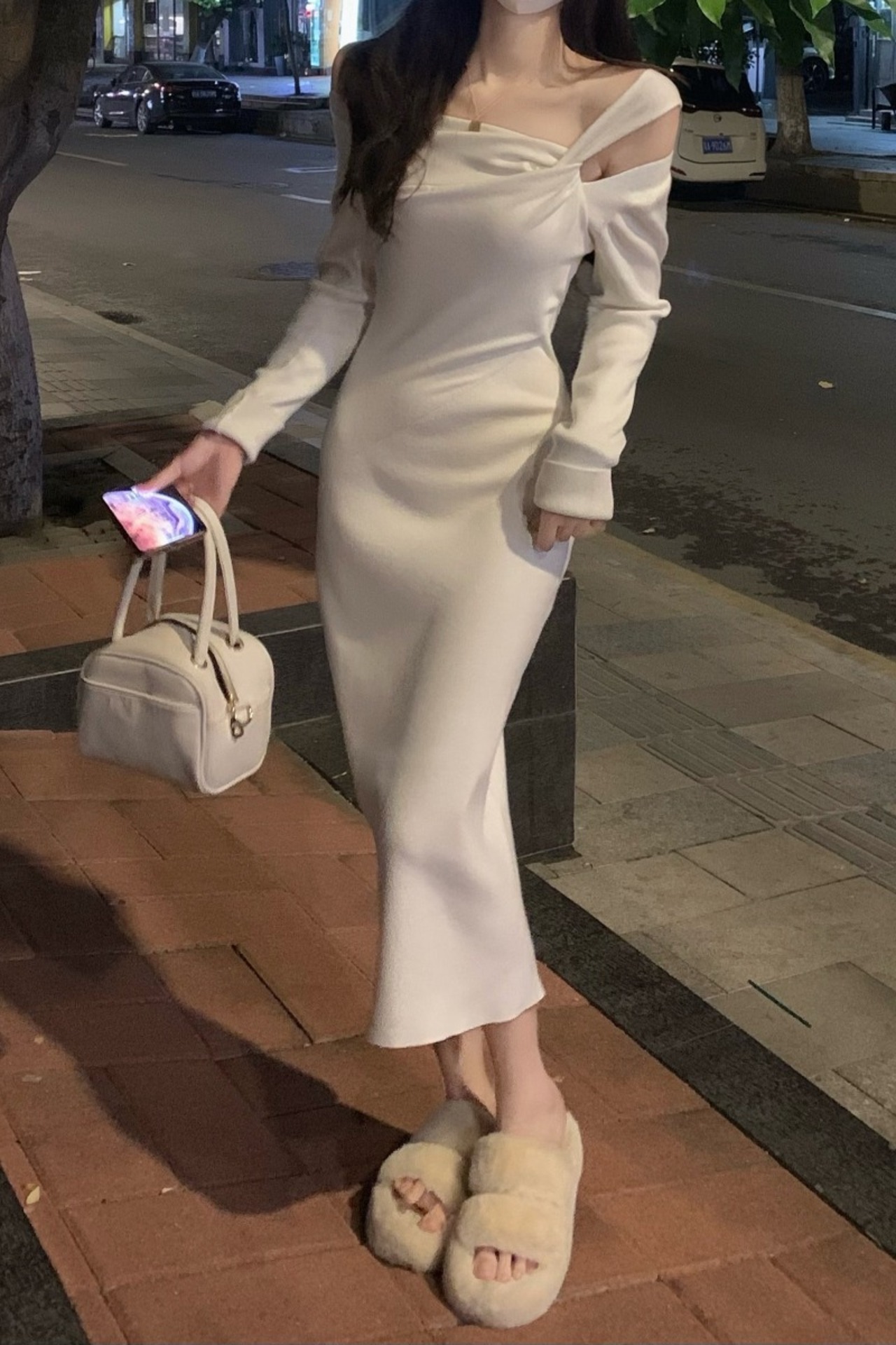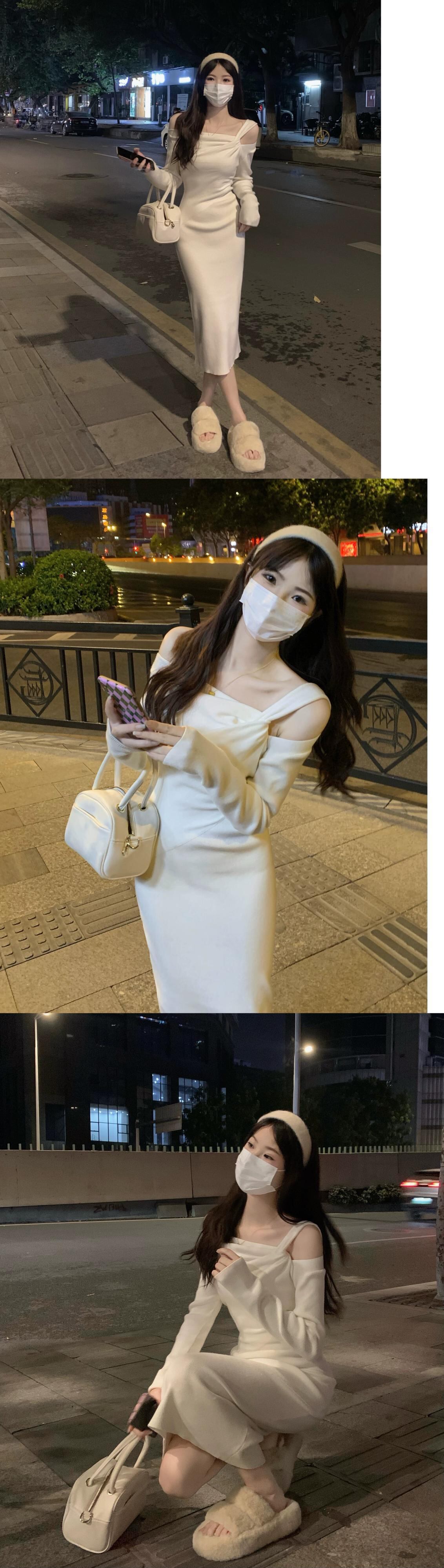 センスニッチセクシーなオフショルダースリム長袖ドレス女性の 2023 春の新しいオールマッチバッグヒップミッドレングススカート ロング スプリング 春物 0921953986378529