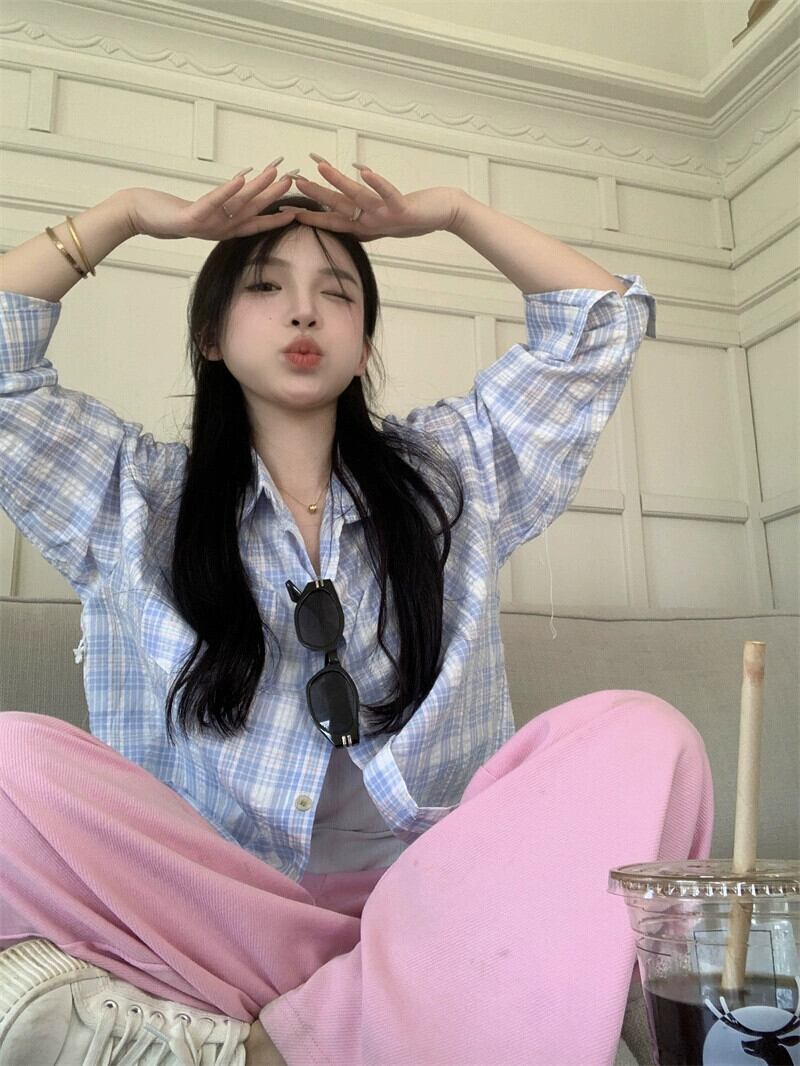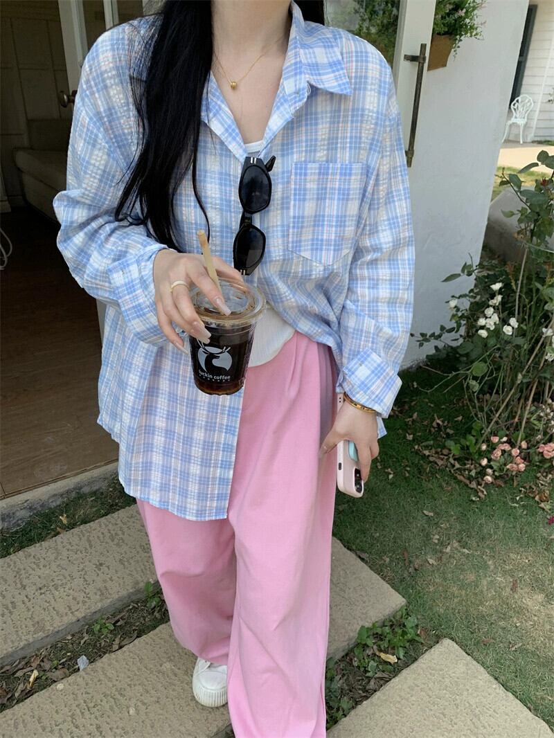 塩は甘いブルーチェック柄長袖シャツジャケットレディース夏2023新年齢削減ルーズオールマッチシャツ ロング 大人ガーリー スウィート キュート カジュアル サマー 夏物 0921914712479616