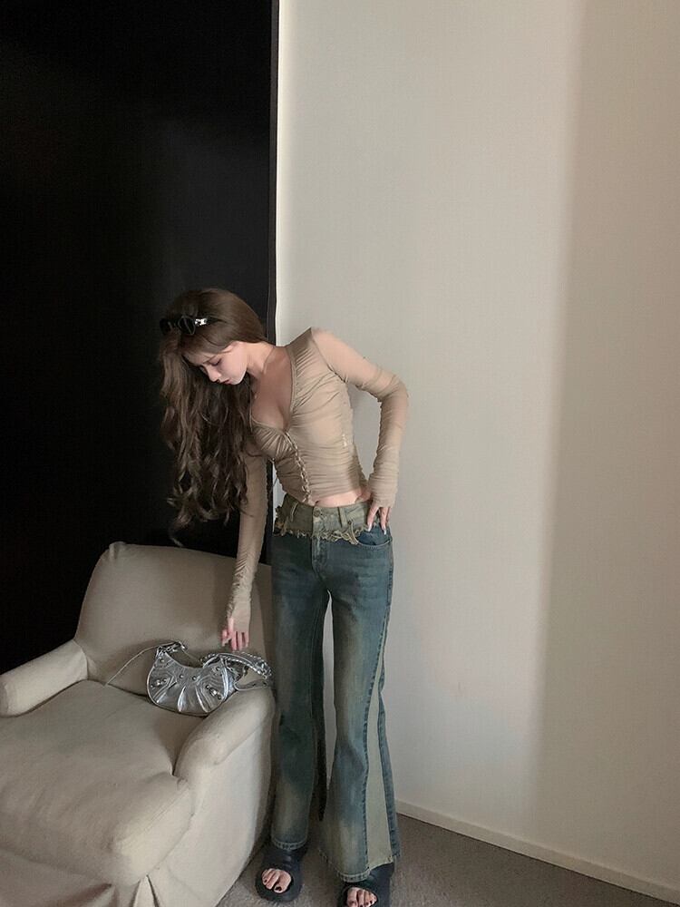 スパイスセクシーな V ネック長袖 Tシャツ女性の春の純粋な欲望の視点折り目自己修養スリムシックなボトリングシャツトップ ロング スプリング 春物 Vネック ピュア 0921937343000725