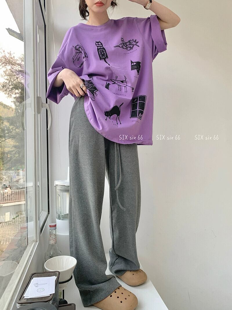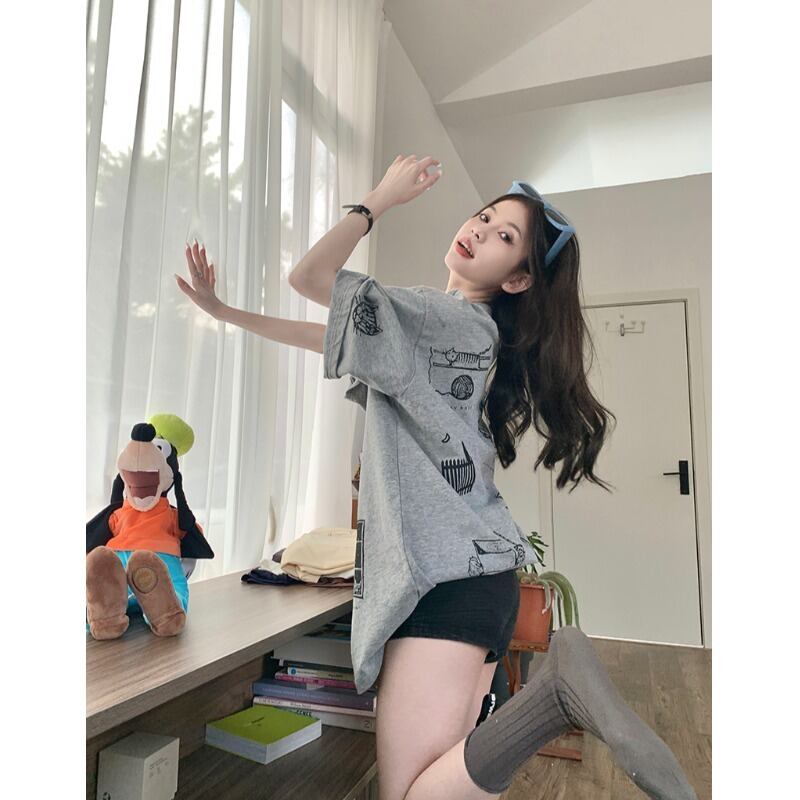 漫画のプリント半袖 T シャツの女性の 2023 夏の新しいルーズで汎用性の高いミッドレングス グレーの半袖トップ サマー 夏物 Tシャツ 092197857941559
