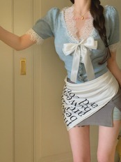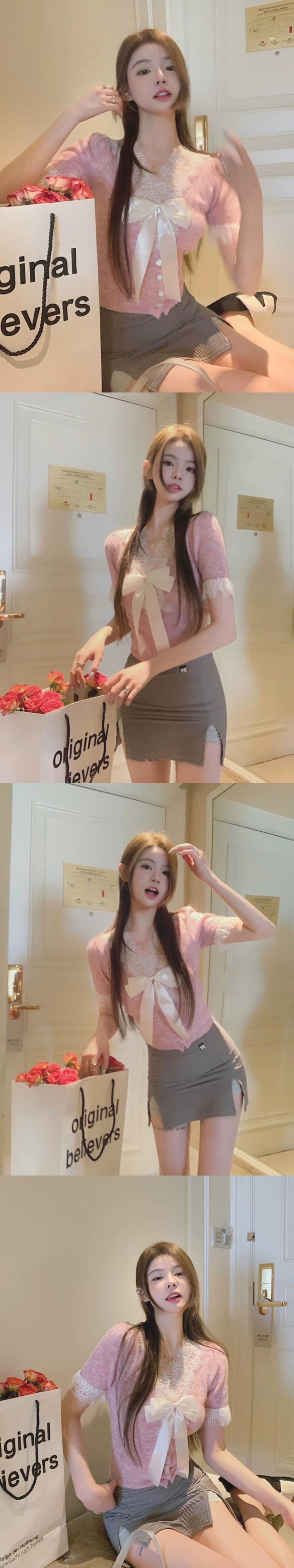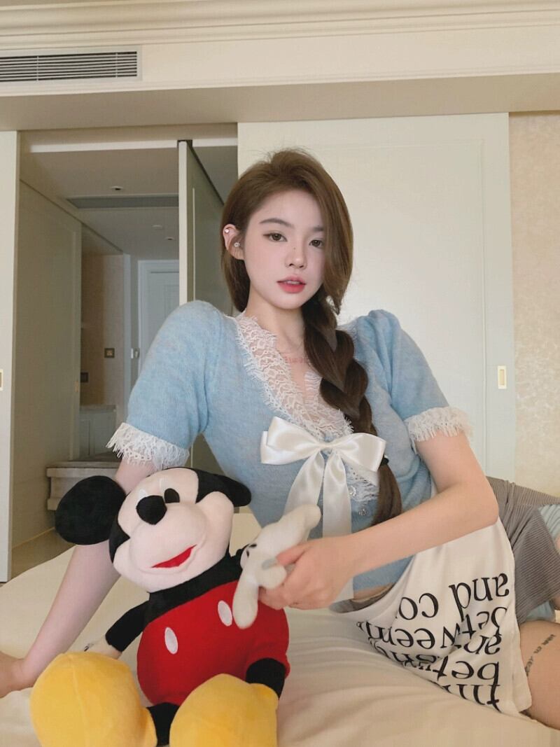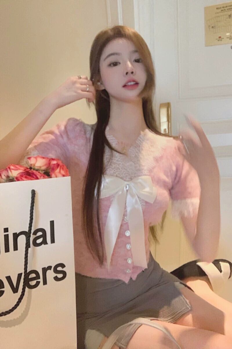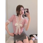 優しい純粋な欲望レース V ネック半袖ニットセーター女性の夏の 2023 新しい甘い弓ショートトップ リボン 大人ガーリー スウィート キュート カジュアル サマー 夏物 Vネック ピュア 0921951525480287