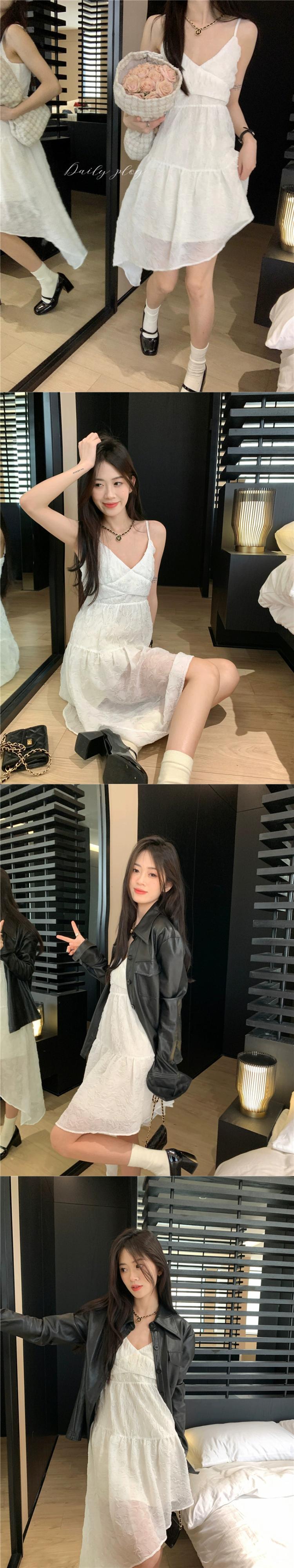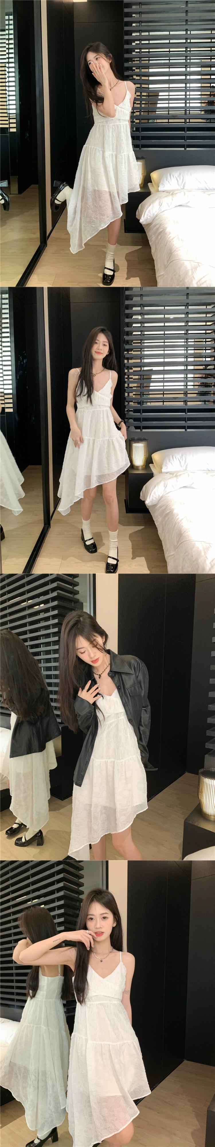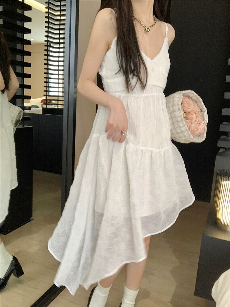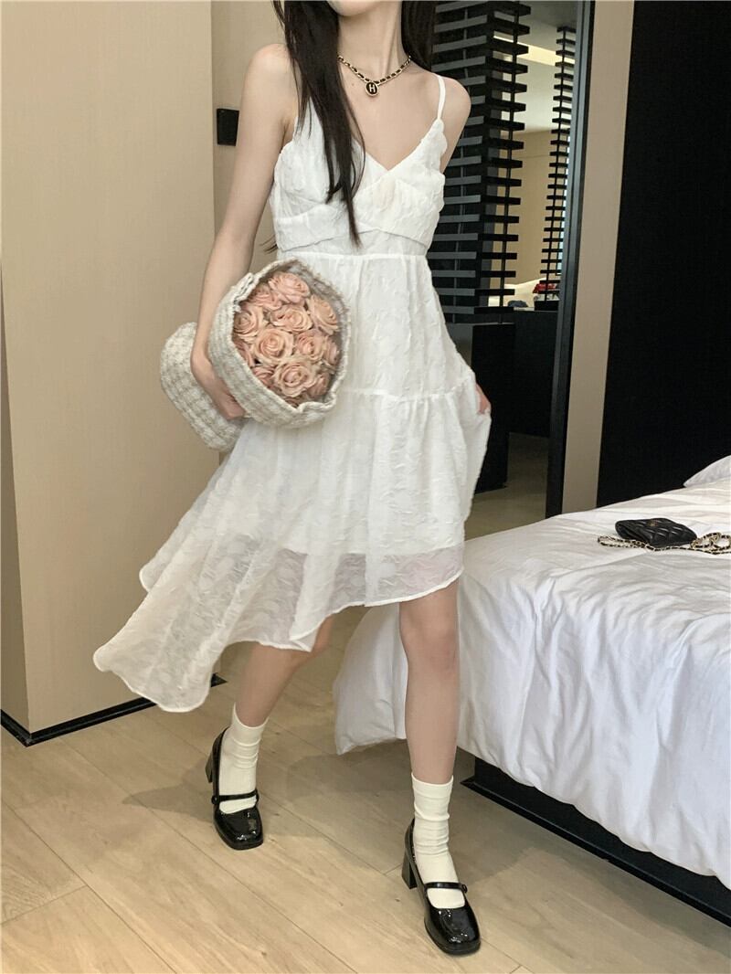 フレンチバレエスタイルの白い V ネックサスペンダードレスの女性の 2023 夏の新しいスリムで薄い不規則なスカート ホワイト サマー 夏物 Vネック 0921980601808563