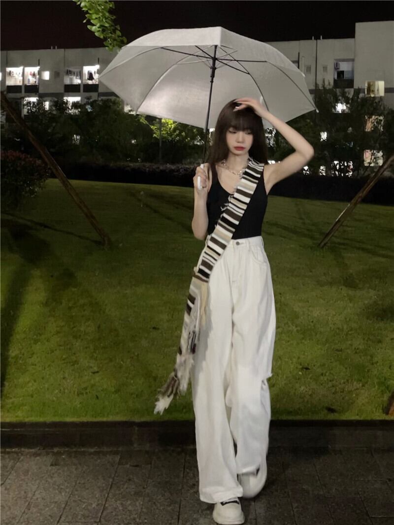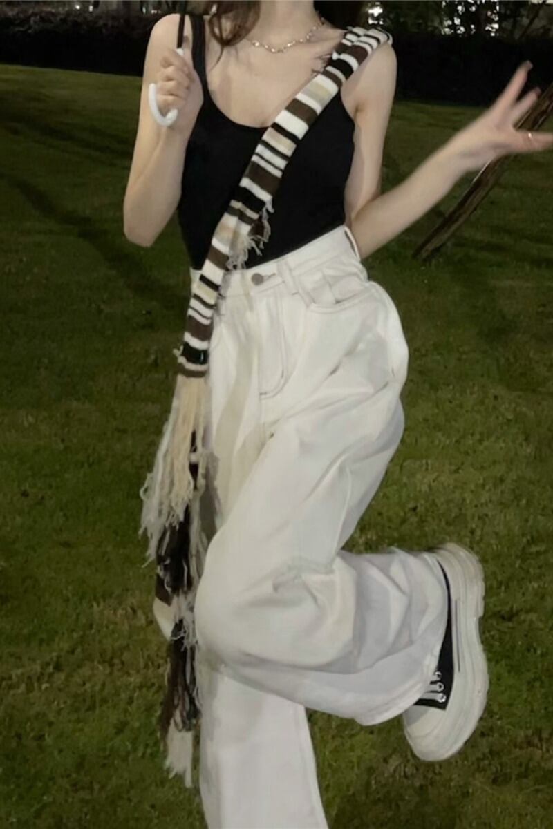ウエスト薄いリッピングホワイトジーンズレディース夏2023新しいオールマッチカジュアルワイドレッグモップパンツイン サマー 夏物 092198024988183