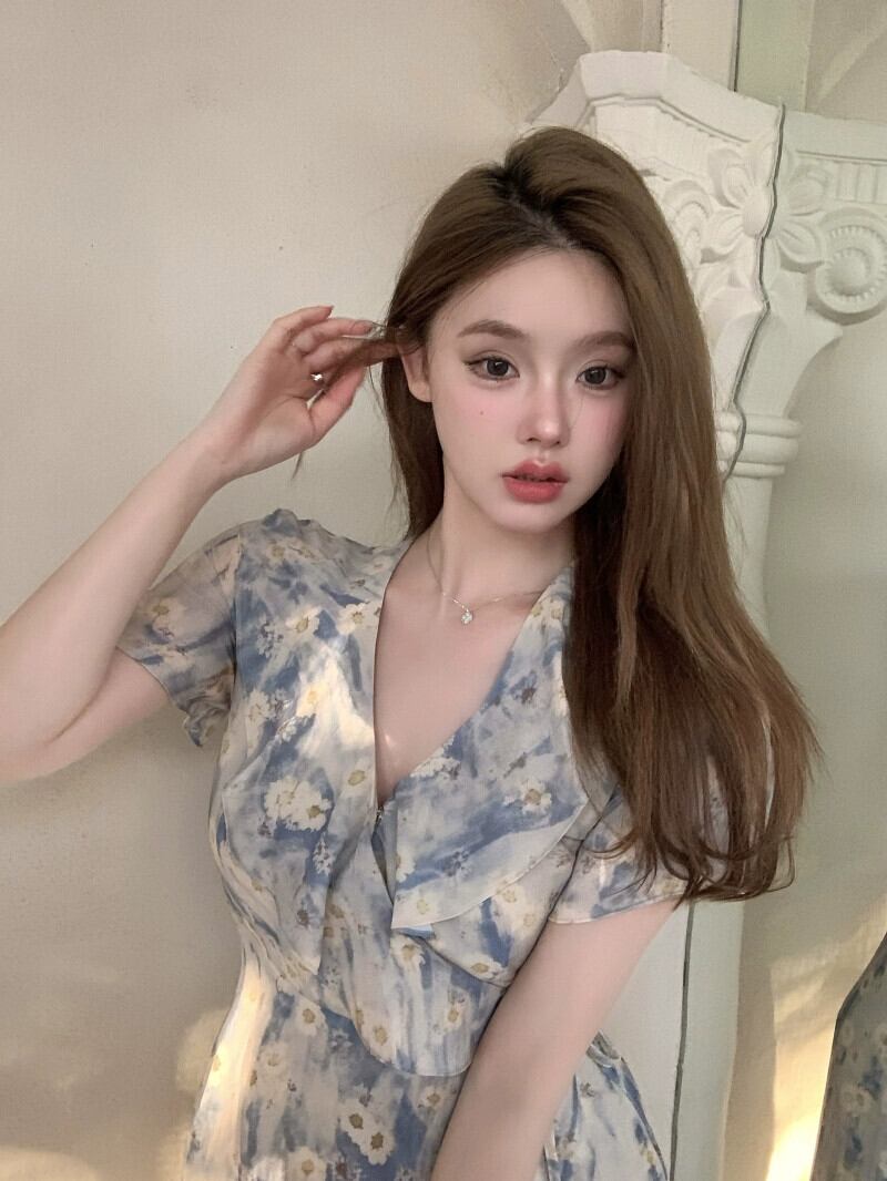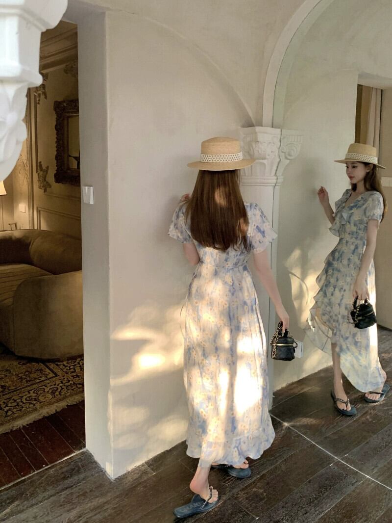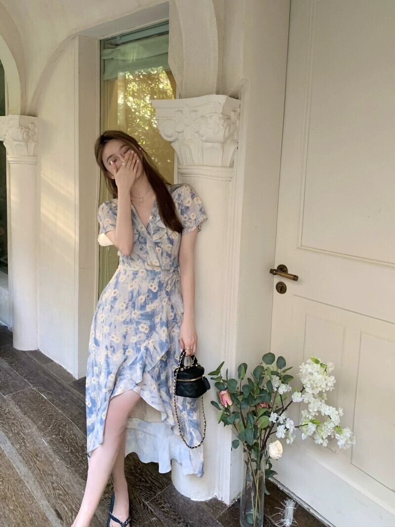 フランスの花柄半袖ドレスの女性の夏の新しい V ネックスカートフリル不規則なセクシーなミドル丈スカート サマー 夏物 Vネック 0921958515458960