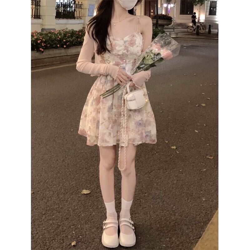 純粋な欲望風甘い花柄スリングドレスの女性の夏の 2023 新しいストラップウエスト痩身 A ラインスカート 大人ガーリー スウィート キュート カジュアル サマー 夏物 Aライン 0921994944954598