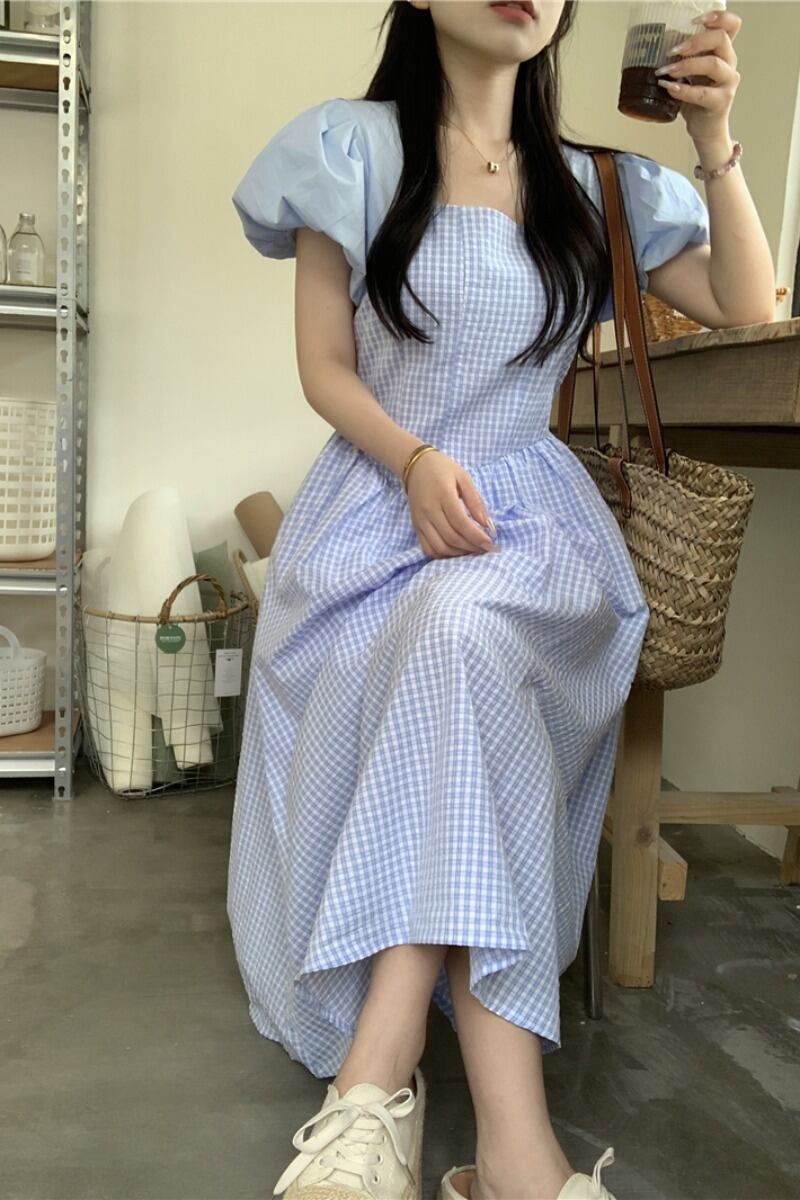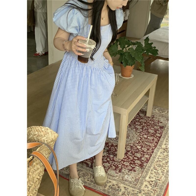 ソルトガールパフスリーブチェック柄ドレス女性夏 2023 フレンチスクエアネックウエストスリムミッドレングスドレス サマー 夏物 スクウェア 092191328172857