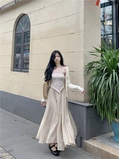 色:アプリコットスリング,ベージュのスカート,アプリコットカーディガン