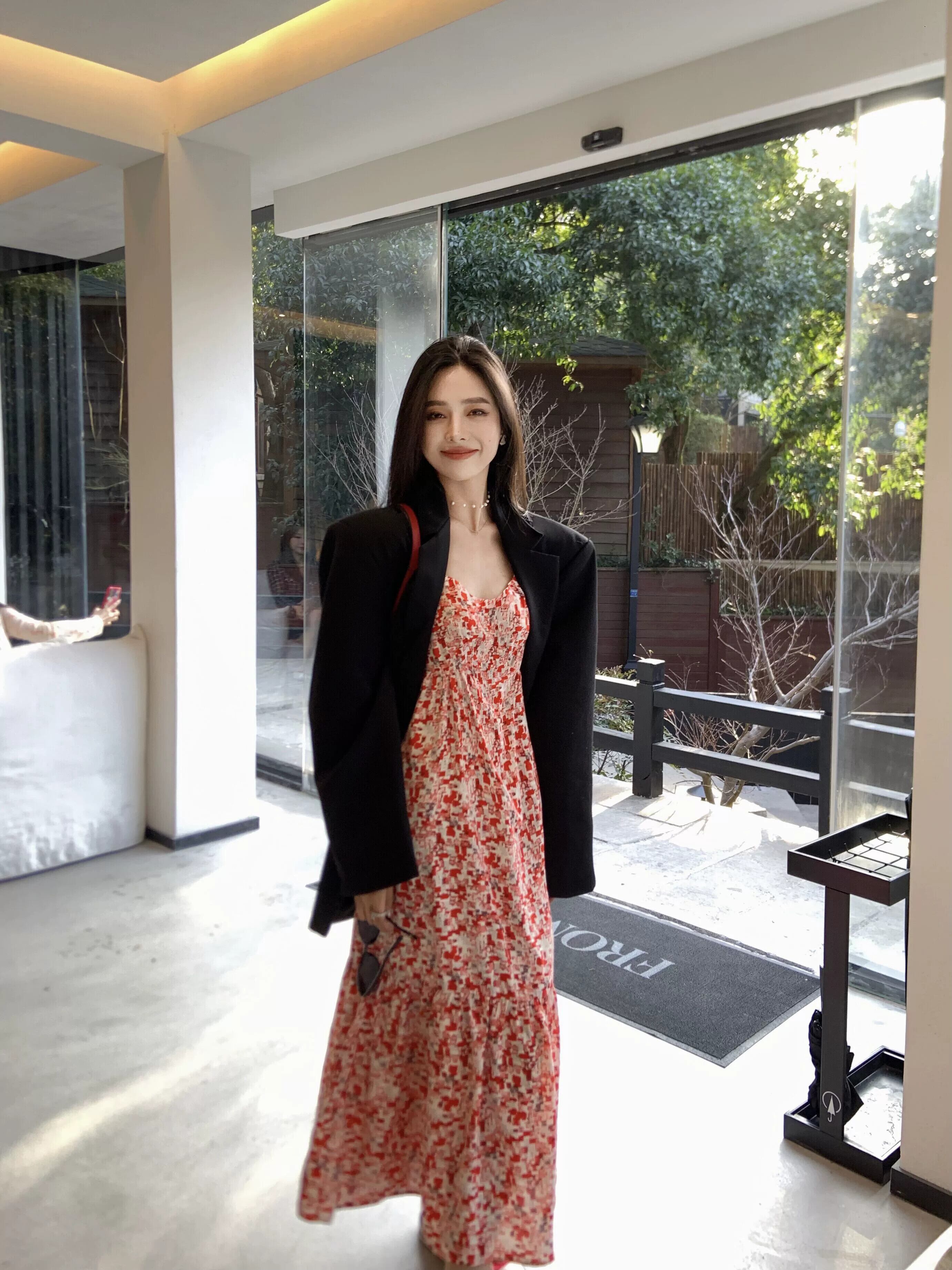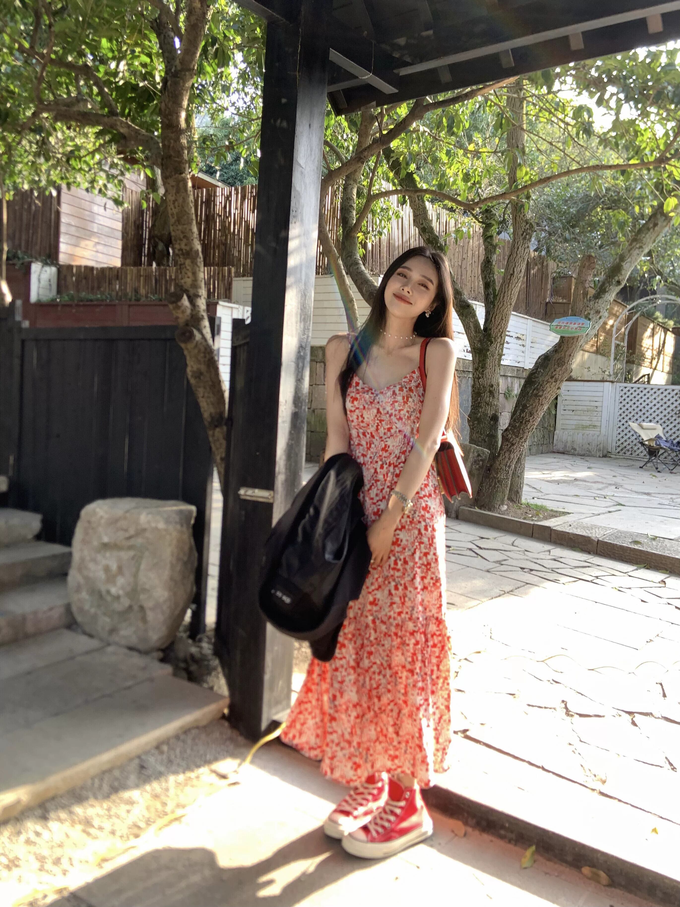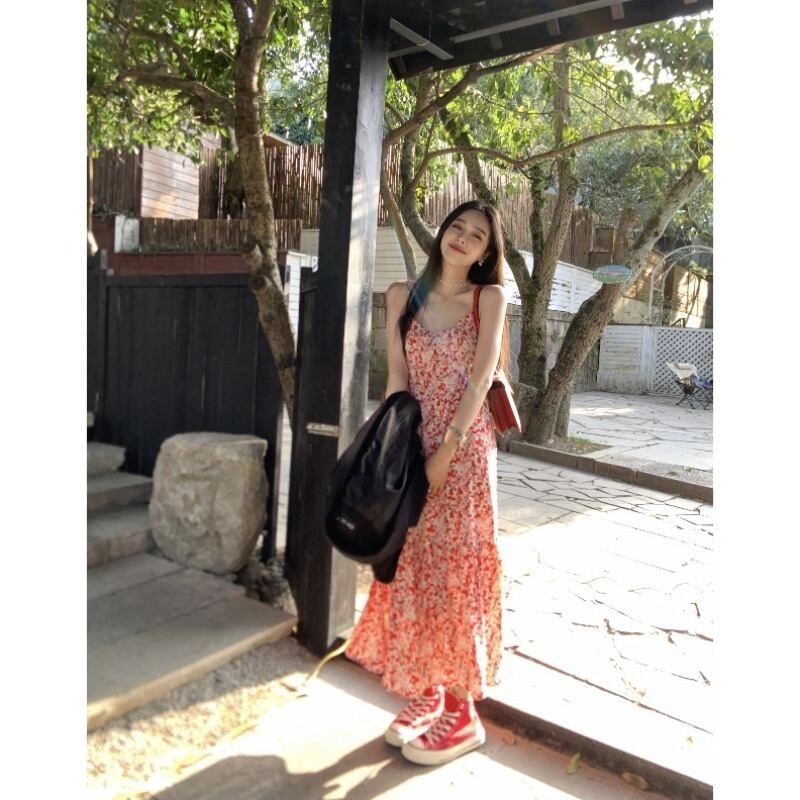 フレンチレッド花柄サスペンダードレス女性の2023年夏新しい気質エレガントなミドル丈ウエストスカート サマー 夏物 092199593117900