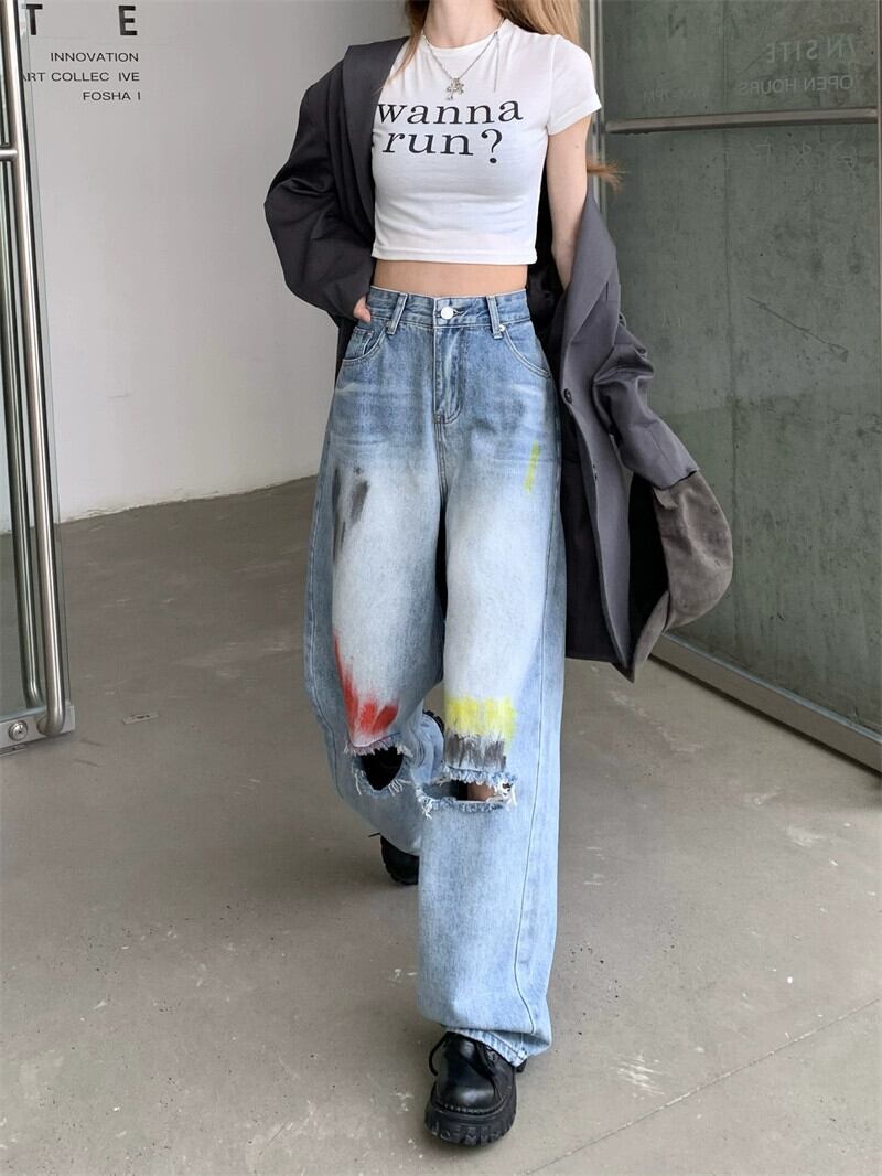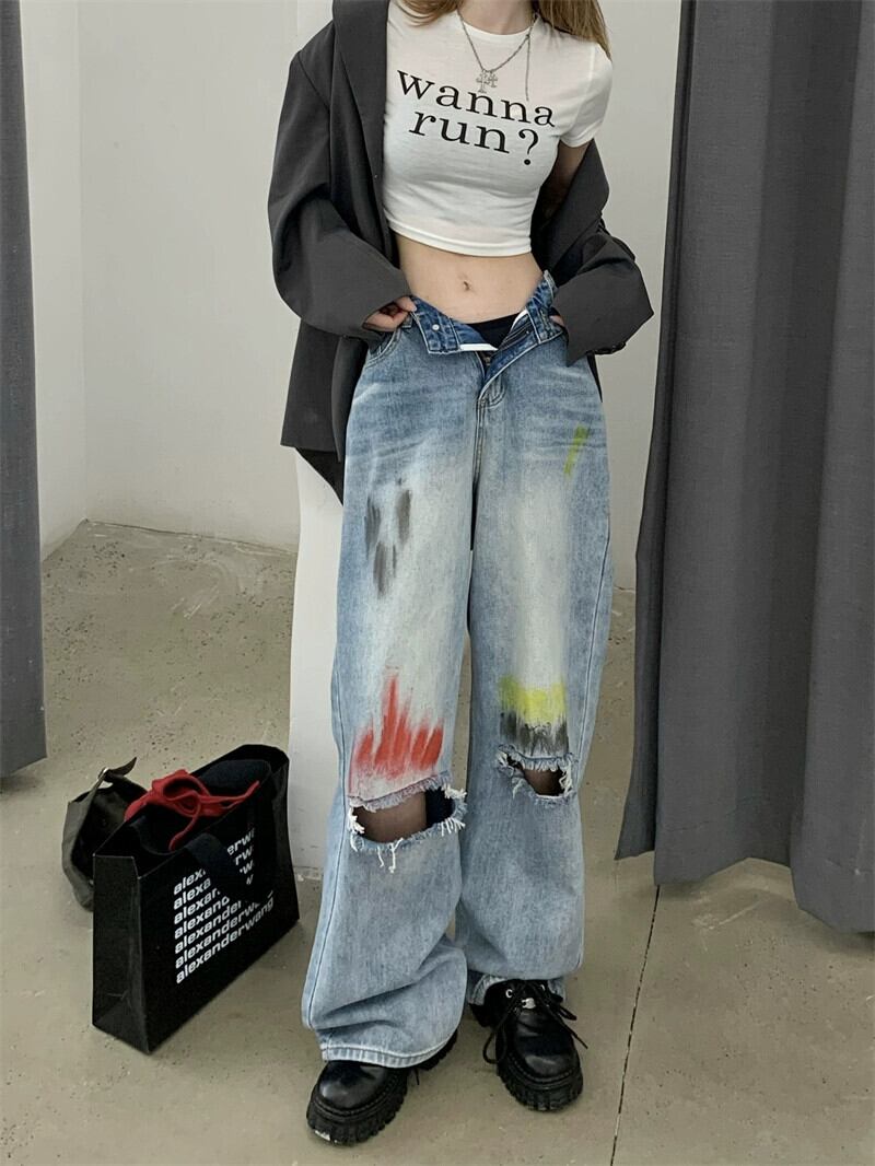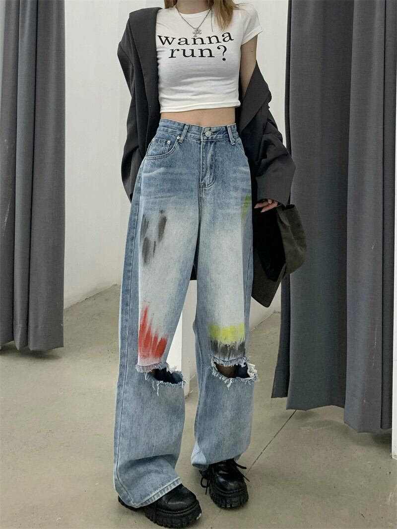 スプラッシュインクリッピングハイウエストルーズスリムジーンズレディース2023春新作オールマッチカジュアルワイドレッグロングパンツ ハイウェスト スプリング 春物 0921959508948874