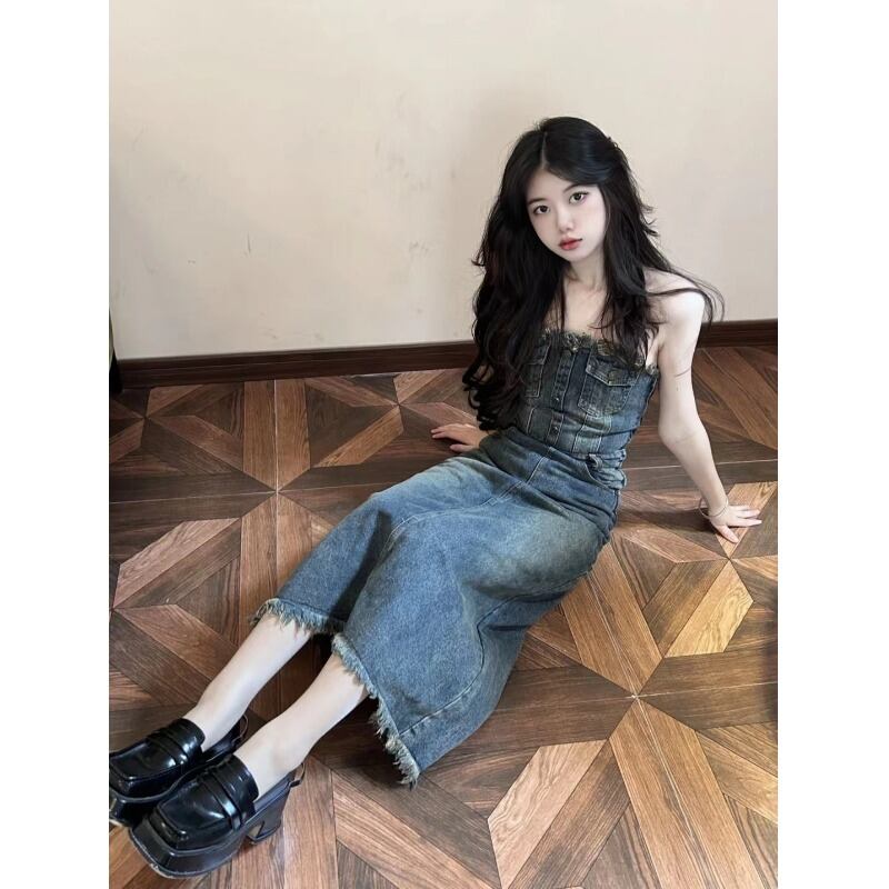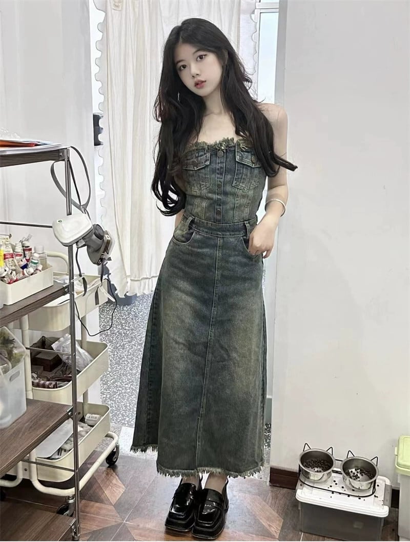 レトロチューブトップデニムスカートレディース夏のデザイン感取り外し可能な細いショルダーストラップウエスト痩身ミドル丈スカート サマー 夏物 0921968149021807