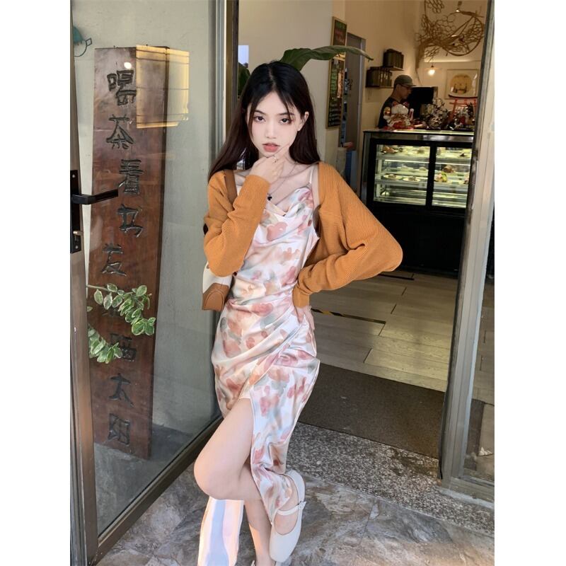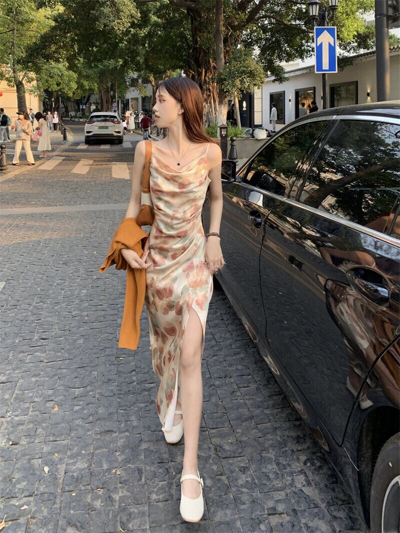 フランスの純粋な欲望風水水墨画スリングドレスの女性の夏の 2023 新しいデザインセンスひだウエストスリットスカート サマー 夏物 ピュア 0921993632148654
