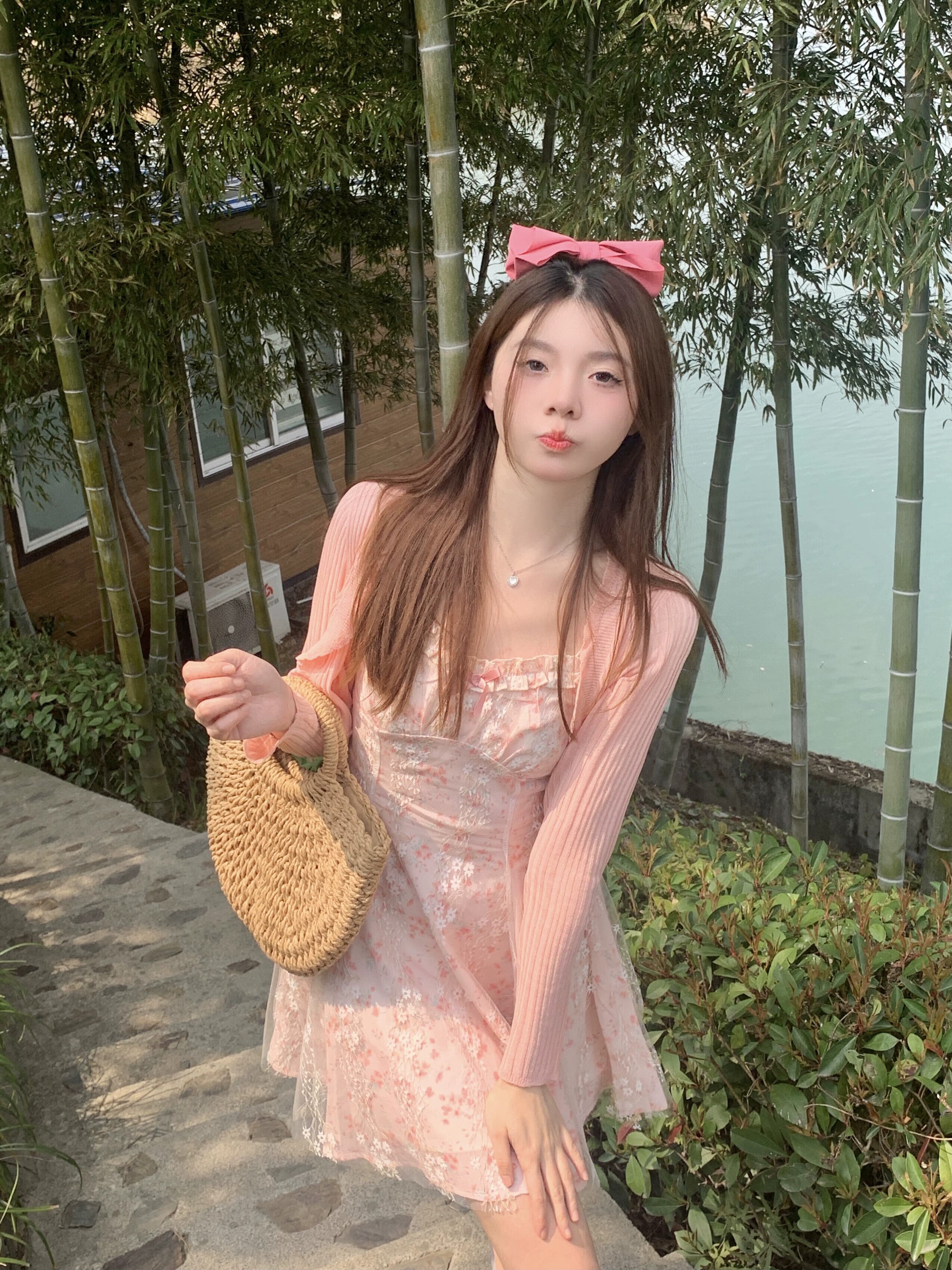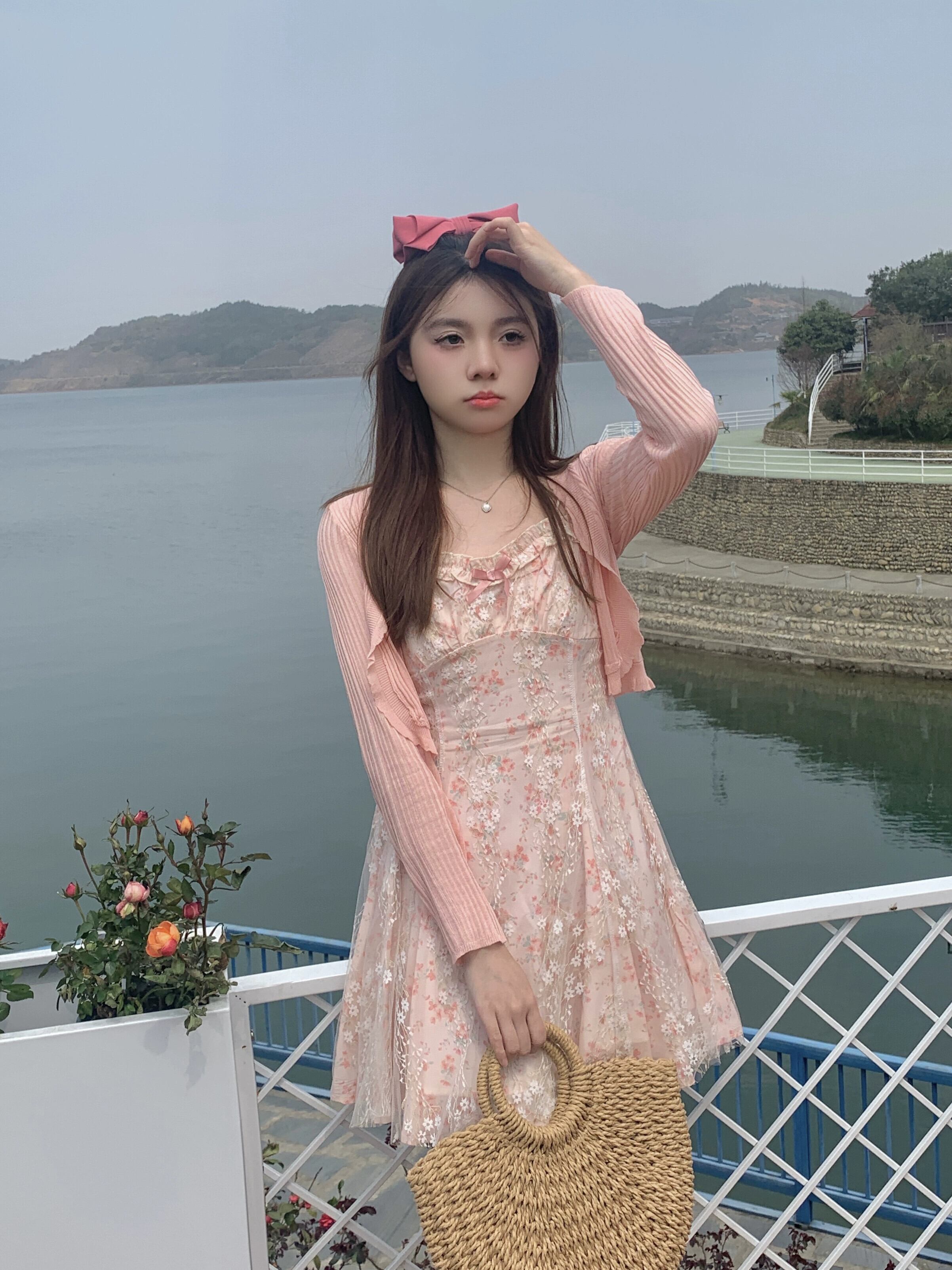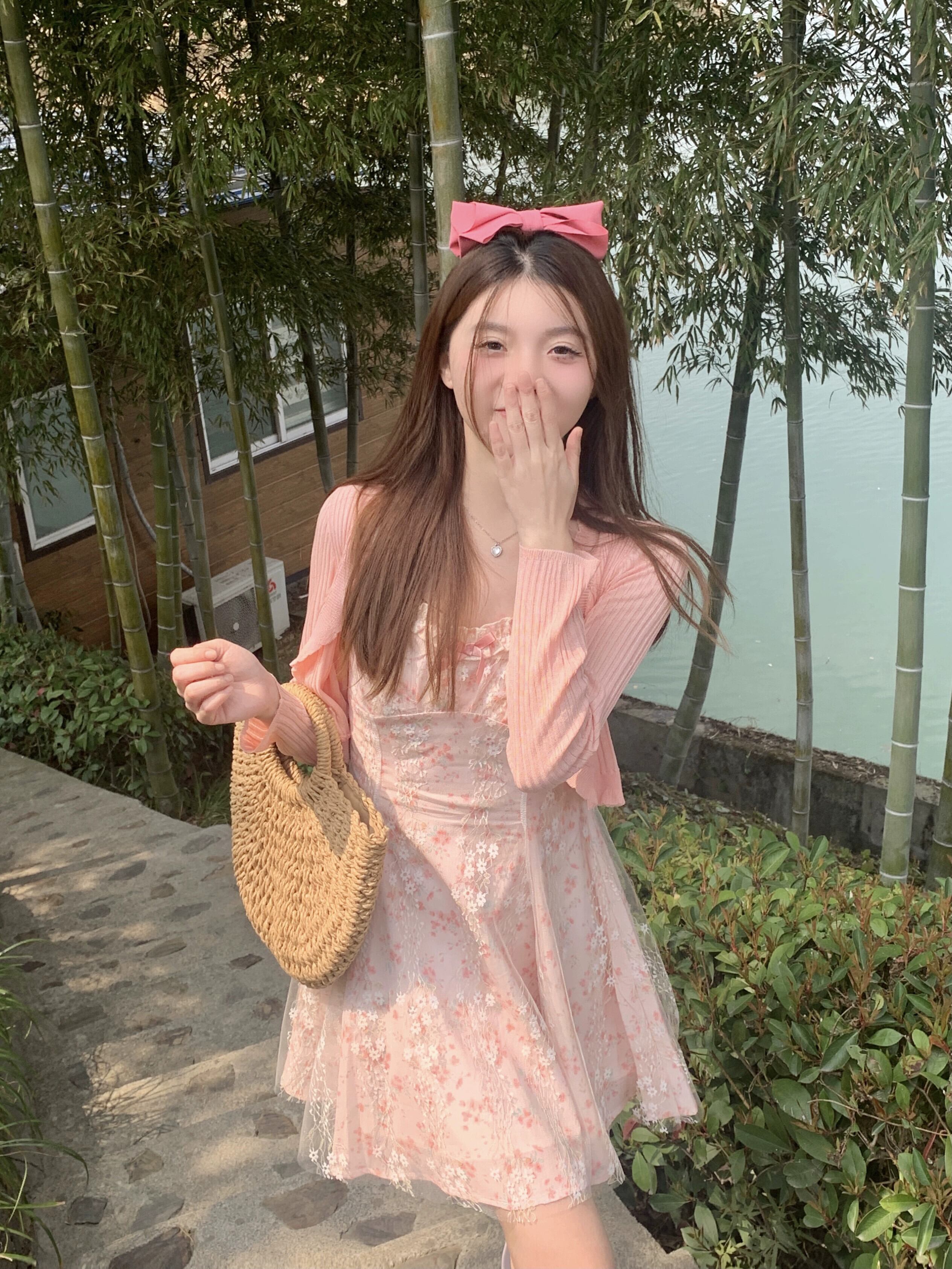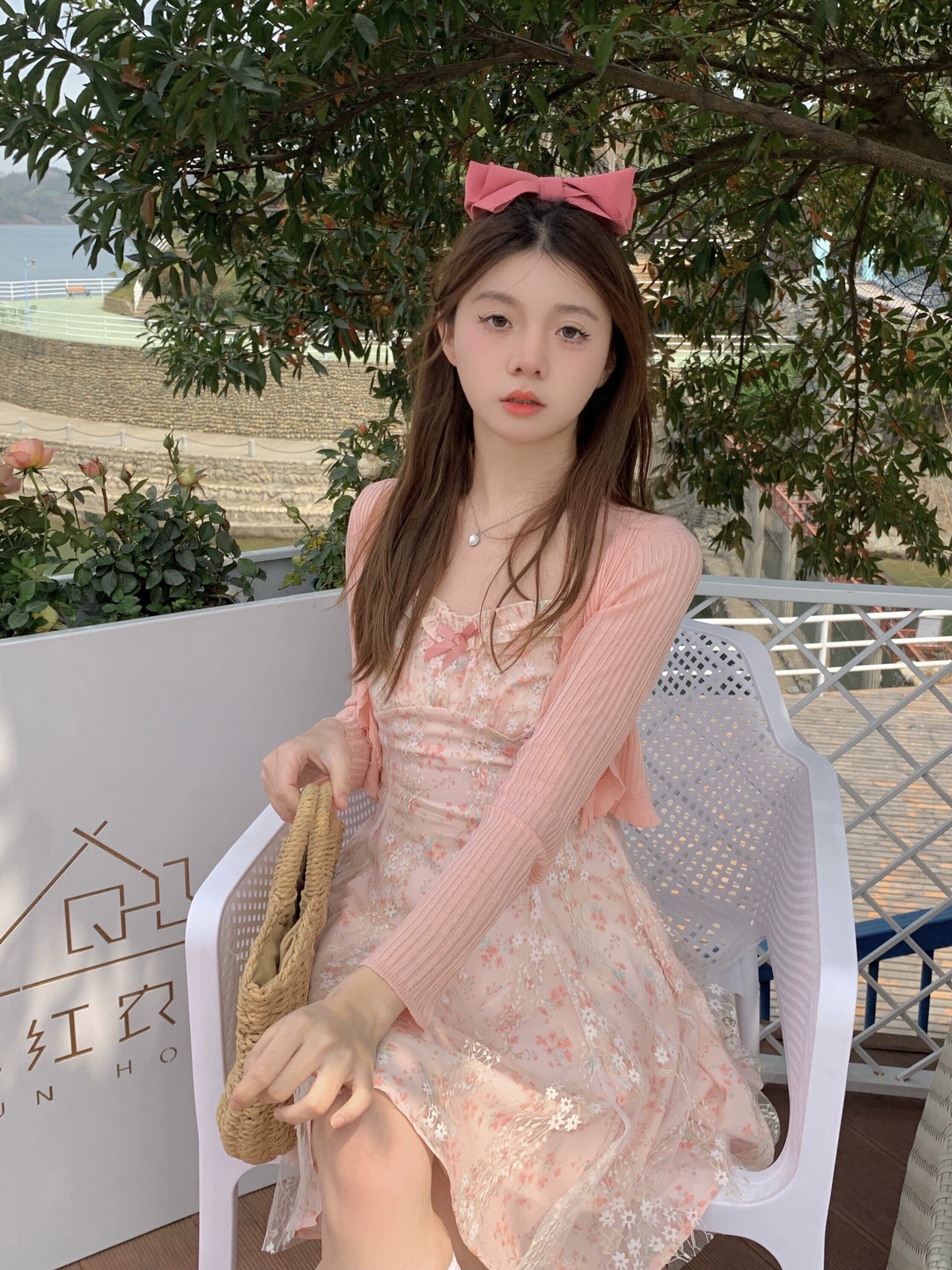 色:ピンクのカーディガン,ピンクのサスペンダードレス