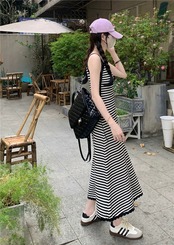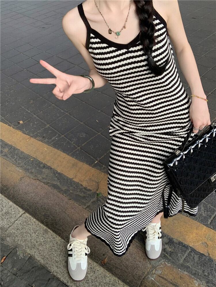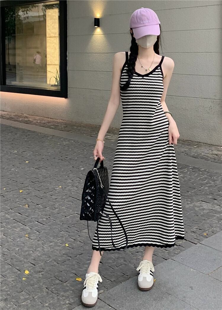 レイジーウィンドストライプ V ネックサスペンダードレス女性の夏の 2023 新しいオールマッチスリムスリムボトムミッドレングススカート サマー 夏物 Vネック 0921922000621215