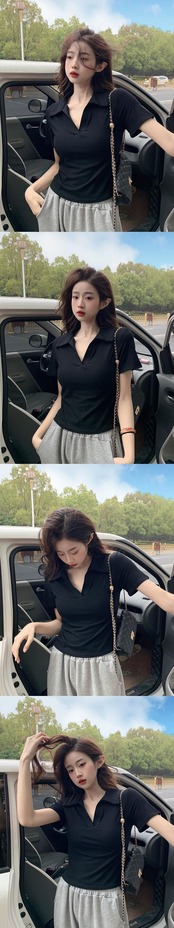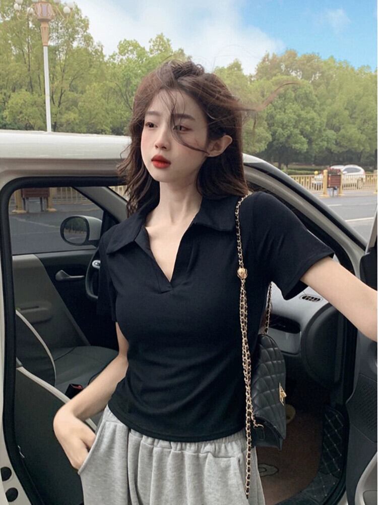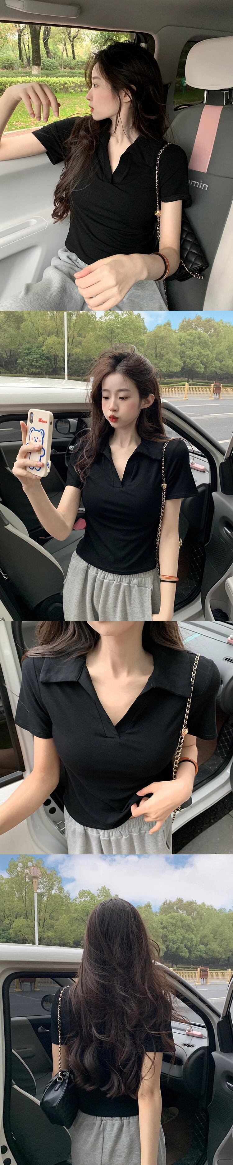 バージョンの無地オールマッチポロカラー半袖 Tシャツ女性の夏の 2023 新しいスリムスリムファッションショートトップ サマー 夏物 ソリッドカラー 092193409222537
