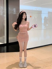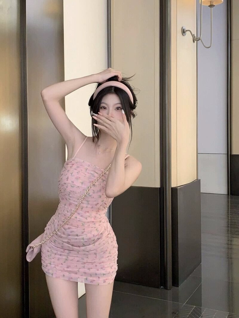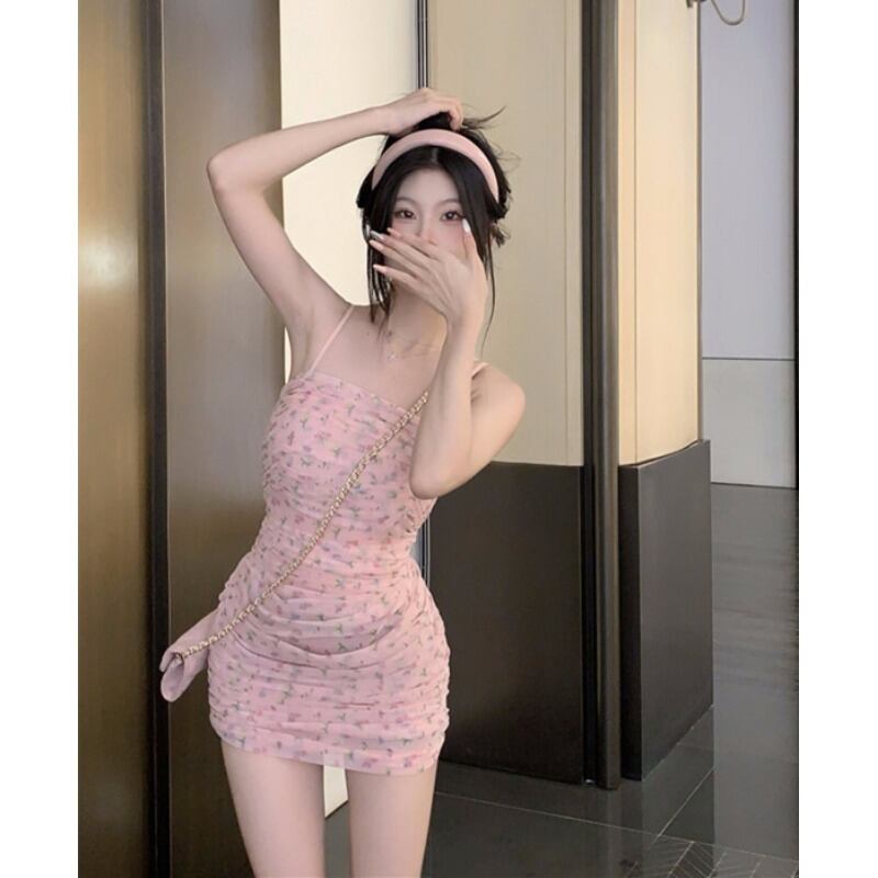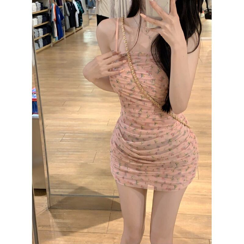 折り花柄メッシュサスペンダードレス女性の夏の 2023 新しい純粋な欲望スタイルスリムフィット底バッグヒップスカート サマー 夏物 ピュア 0921957354714114