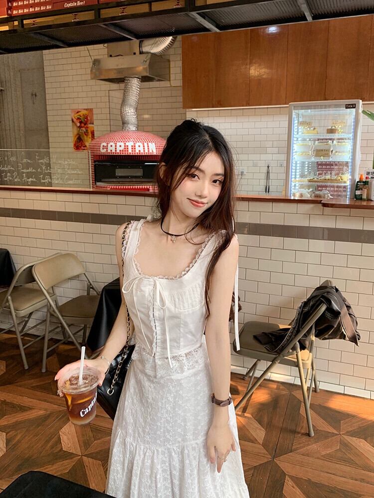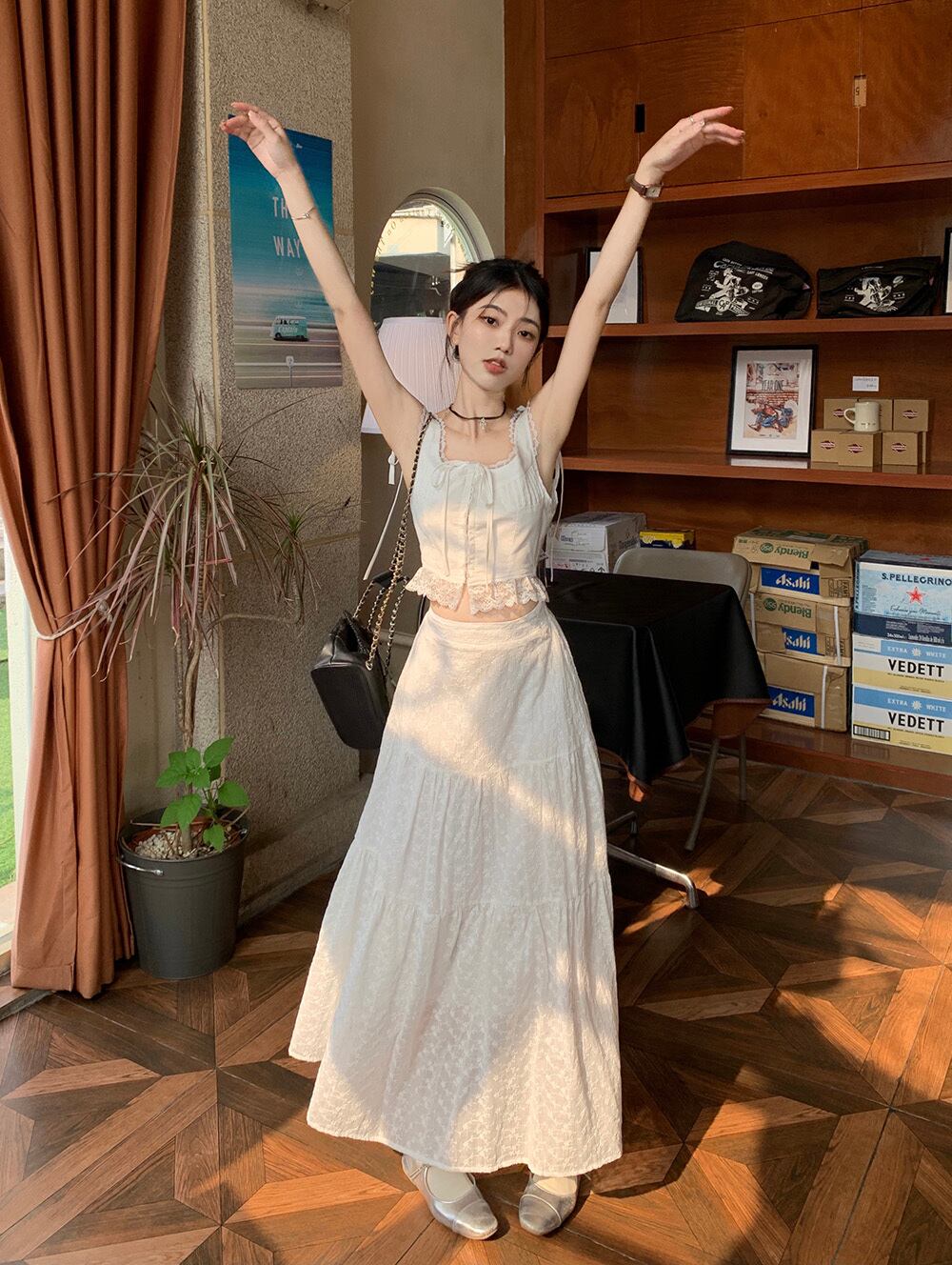 フランス重工業レースステッチキャミソールレディースサマースーツハイウエストミドル丈スカート気質2点セット ハイウェスト 夏物 0921926372744492