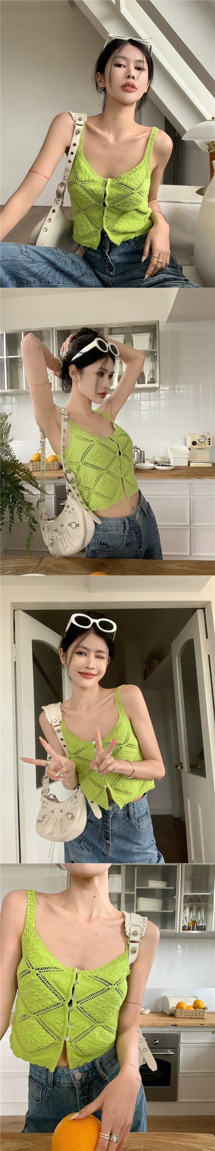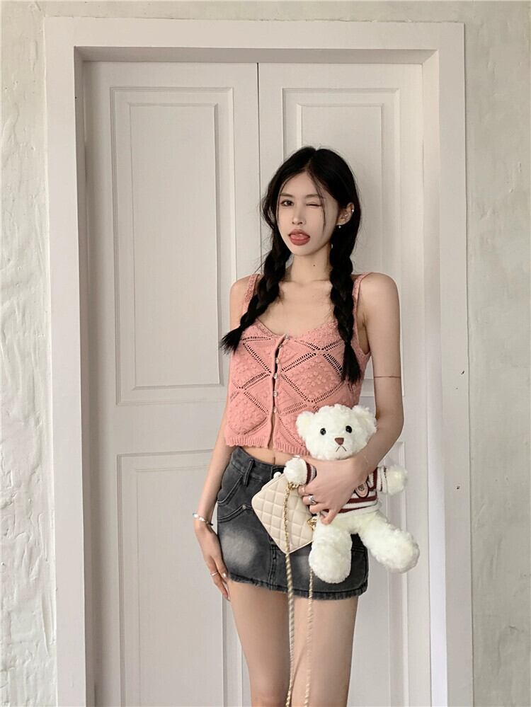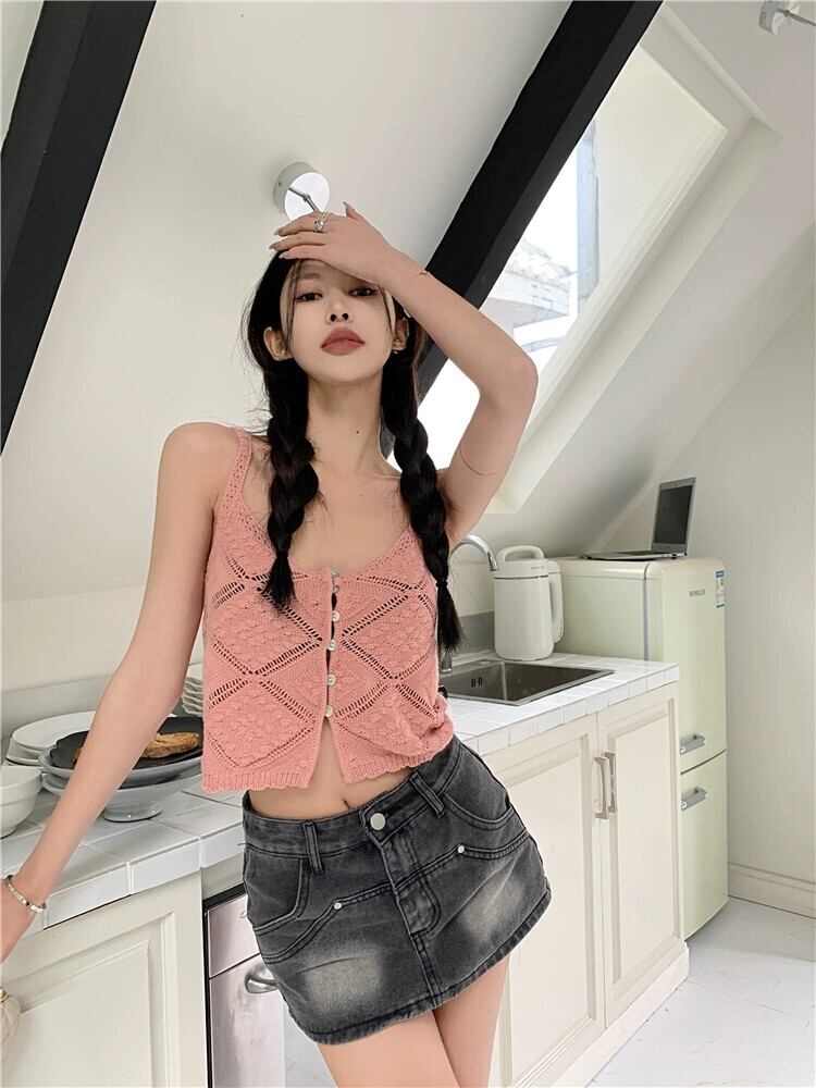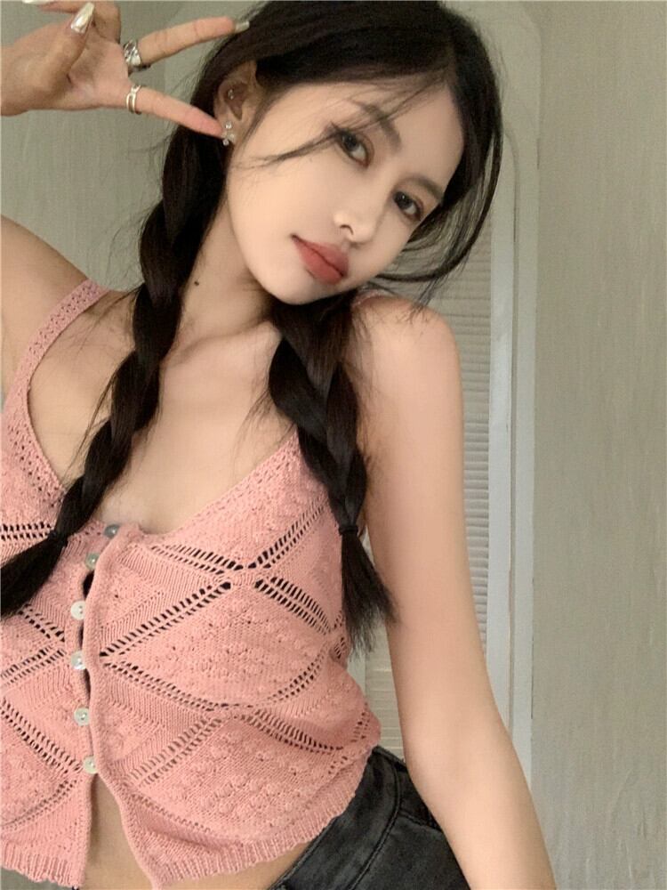 センスニッチスタイル中空ニットベスト女性の夏 2023 新しいシックなスリムスリムショートトップ サマー 夏物 0921955917749694