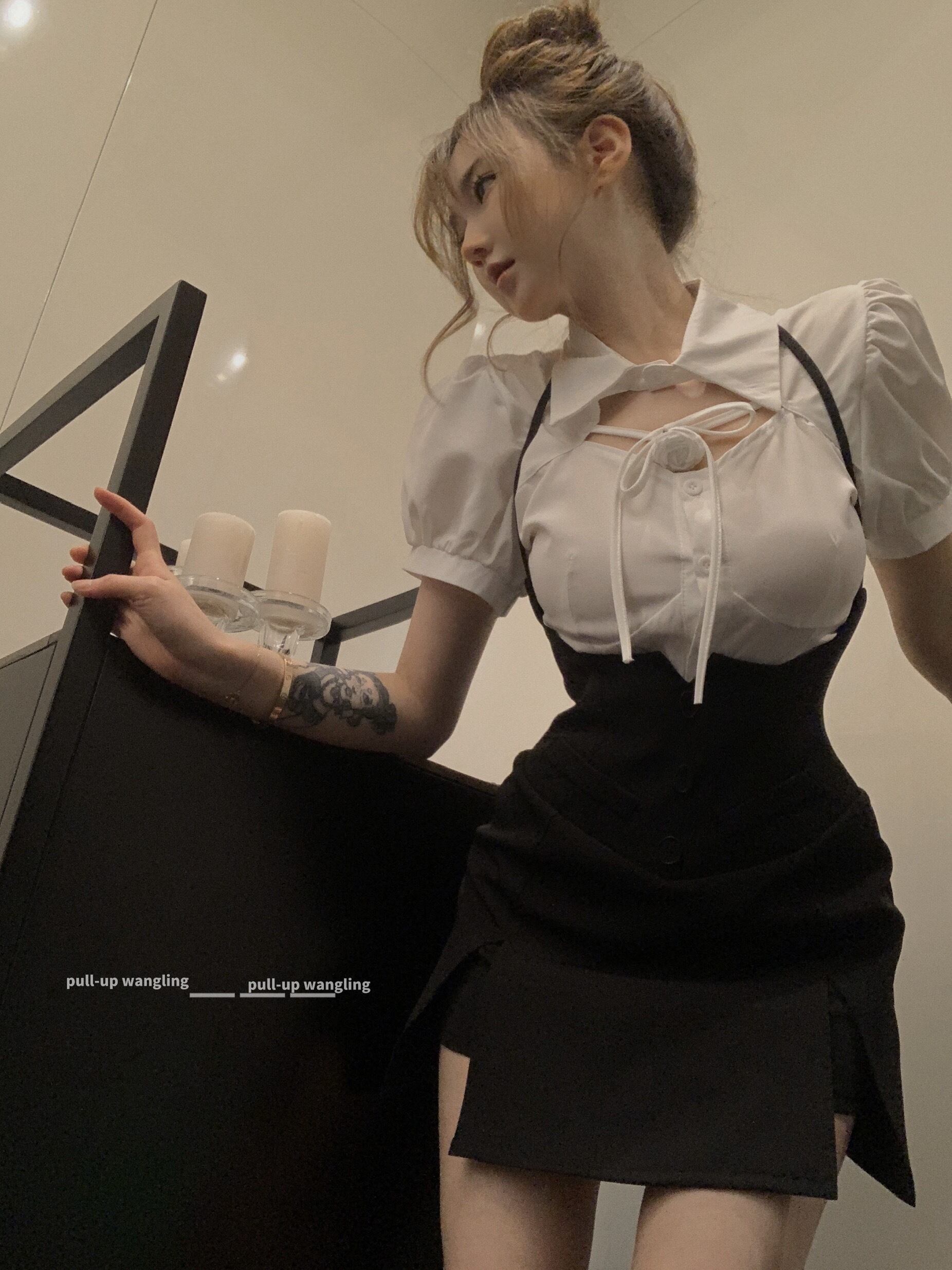純粋な欲望のセクシーなスタイルのスーツの女性の夏 2023 新しい中空半袖シャツバッグヒップサスペンダースカート 2 点セット サマー 夏物 0921992598270354