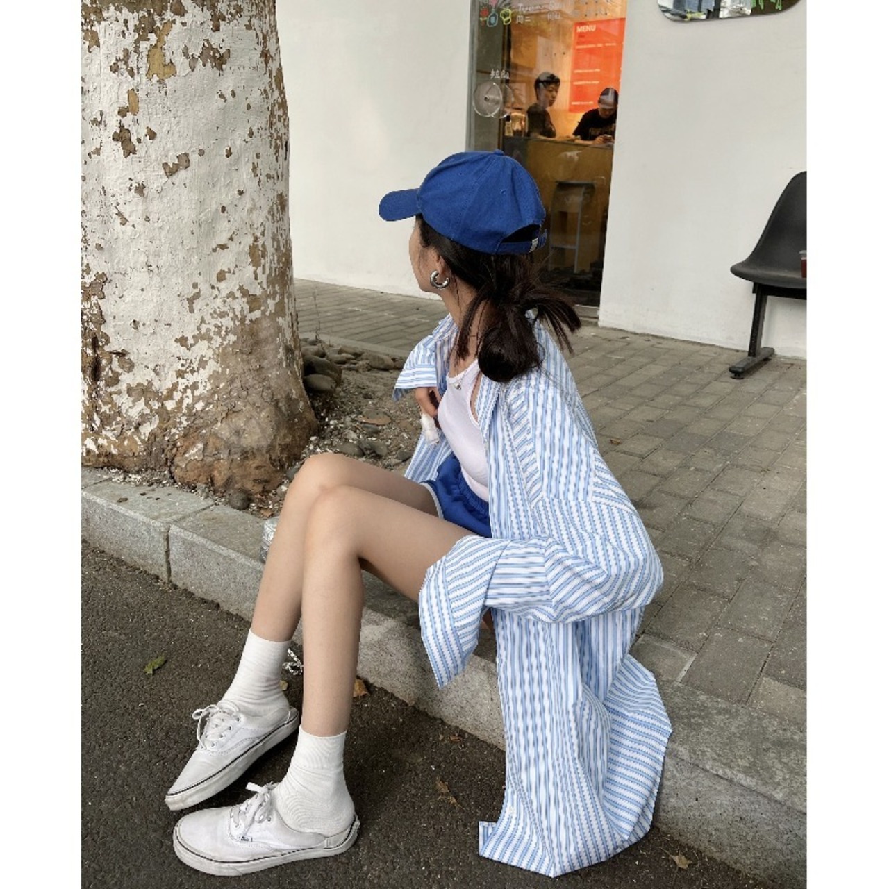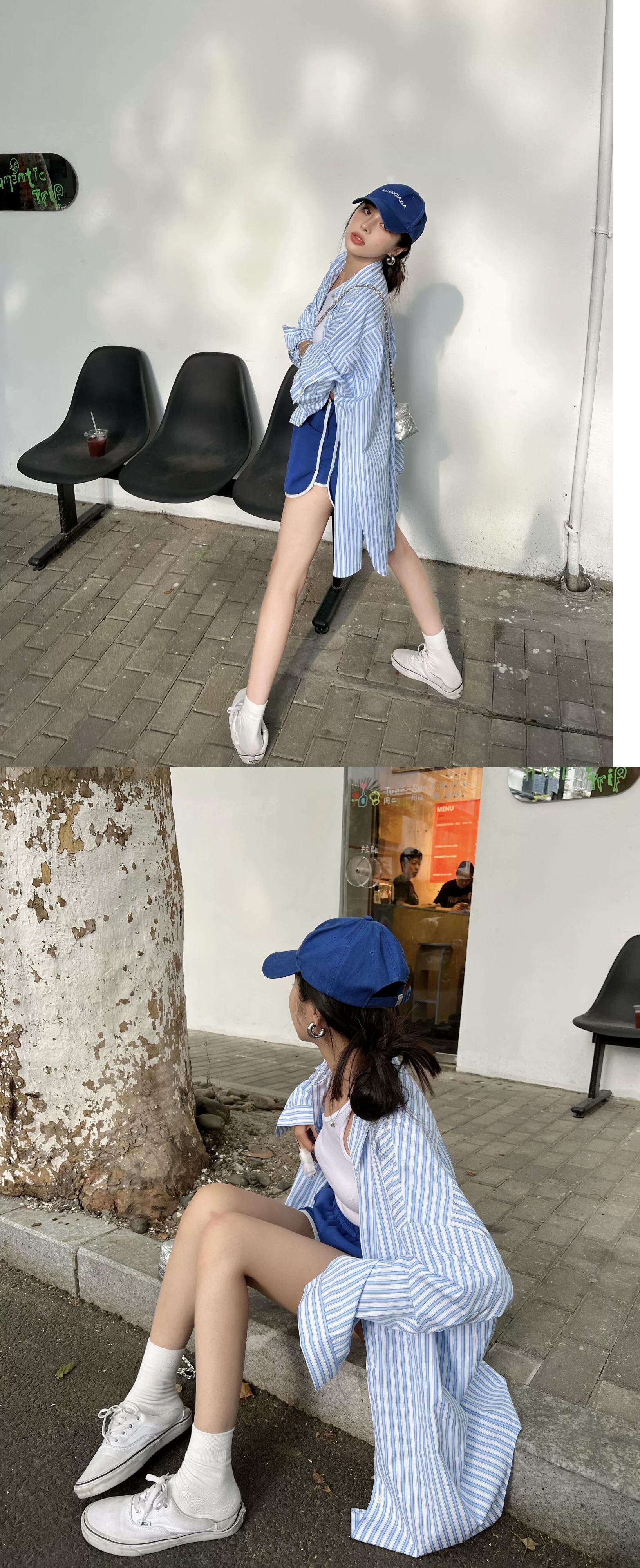 怠惰なスタイルの青と白のストライプ長袖シャツ女性の夏の 2023 新しいカジュアルファッションルーズオールマッチシャツ ロング ホワイト ブルー サマー 夏物 0921975548992147