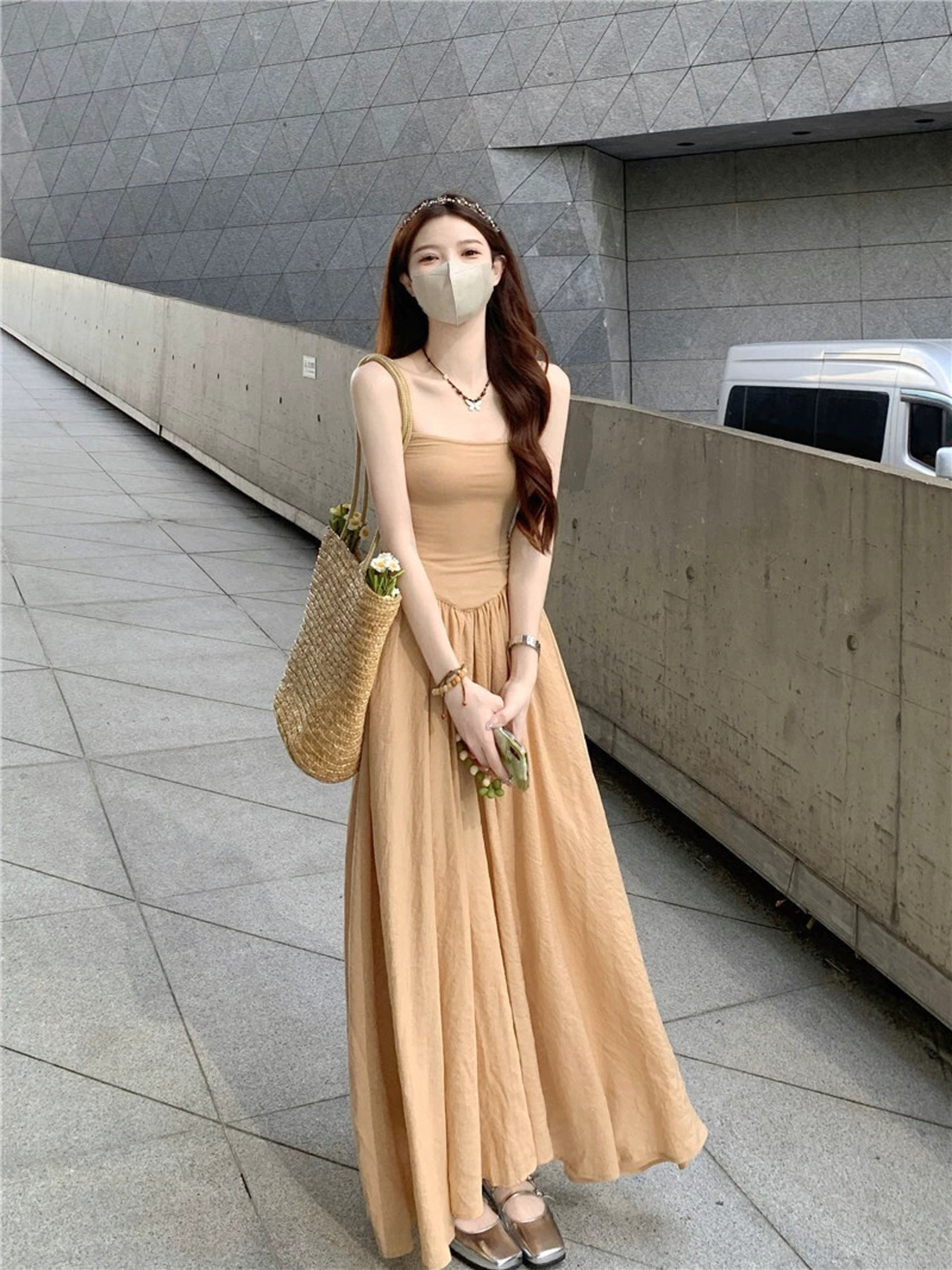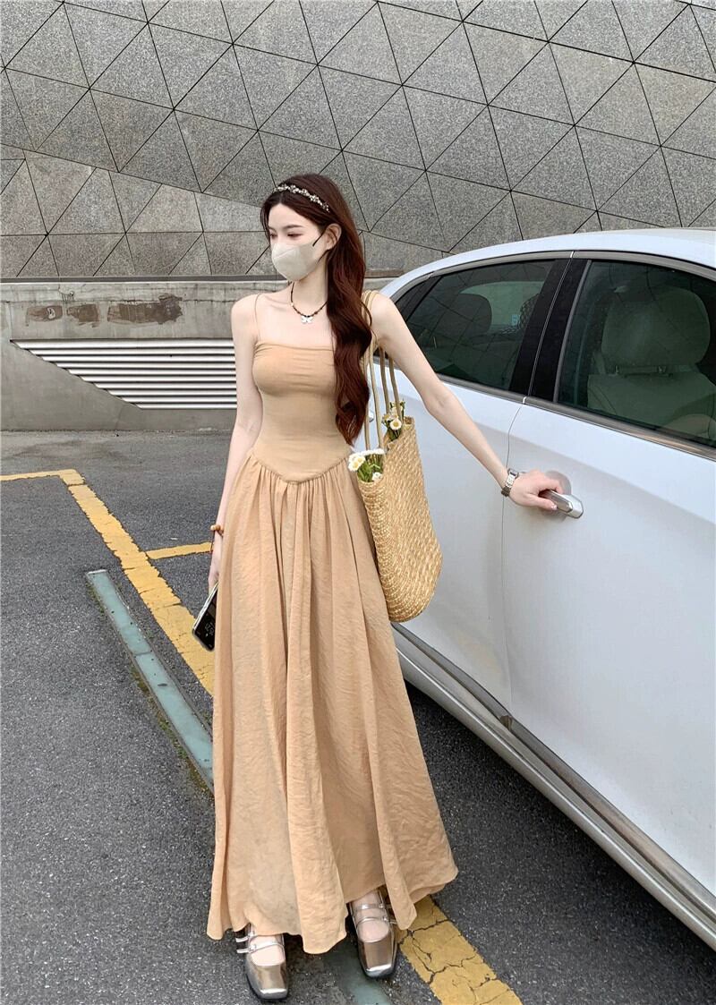 雰囲気のあるヌードアプリコットサスペンダードレス女性の夏の2023新しい穏やかな風自己修養とスリムボトムロングスカート サマー 夏物 0921936777007965