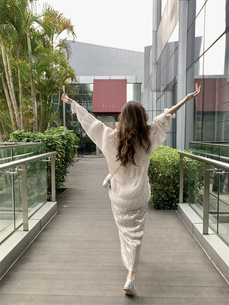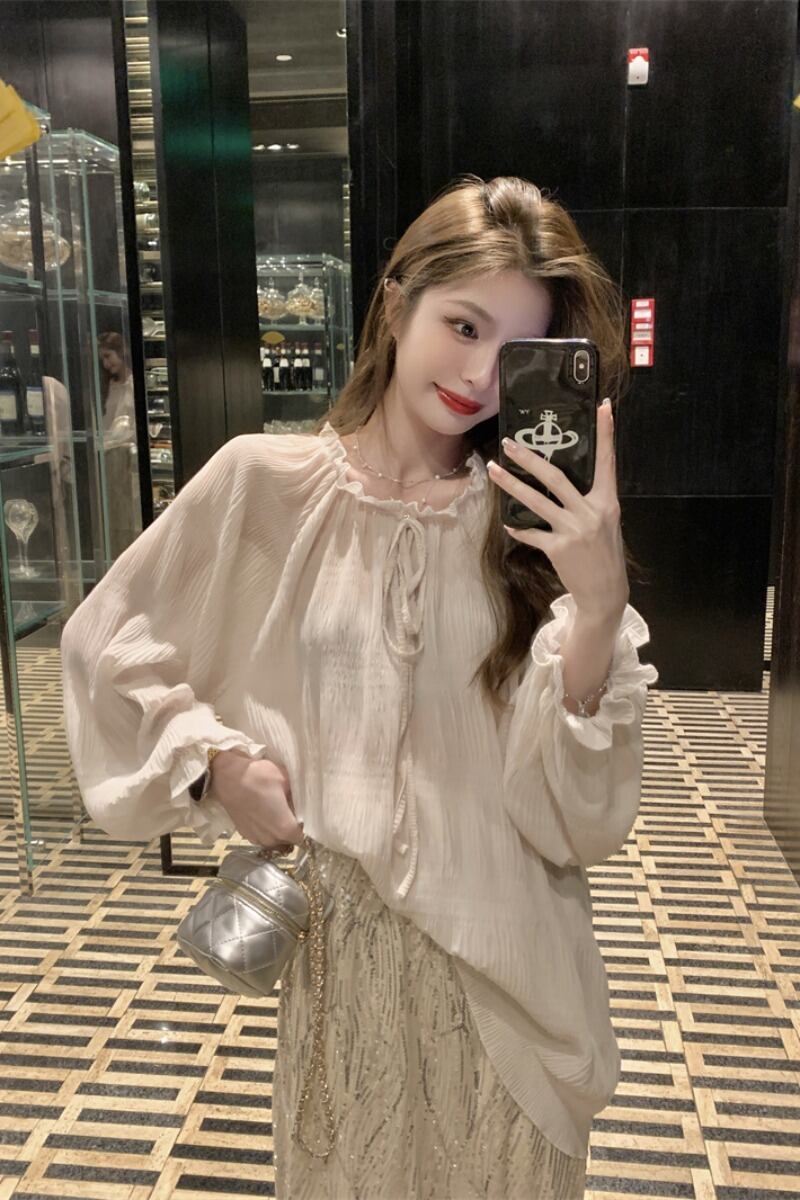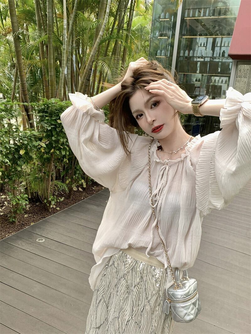 優しい風レースプリーツ長袖シャツ女性の 2023 夏の新しいオールマッチルーズで薄いアウターシャツイン ロング サマー 夏物 092191292548643