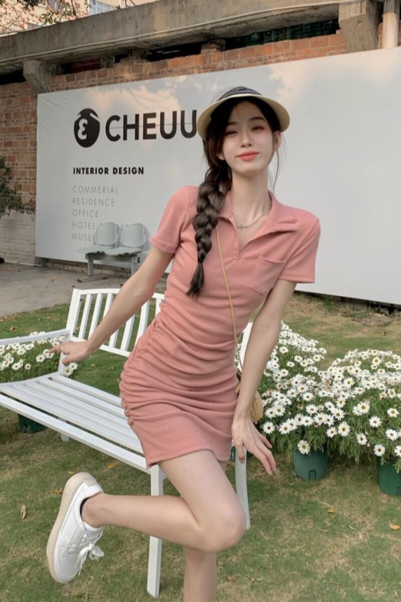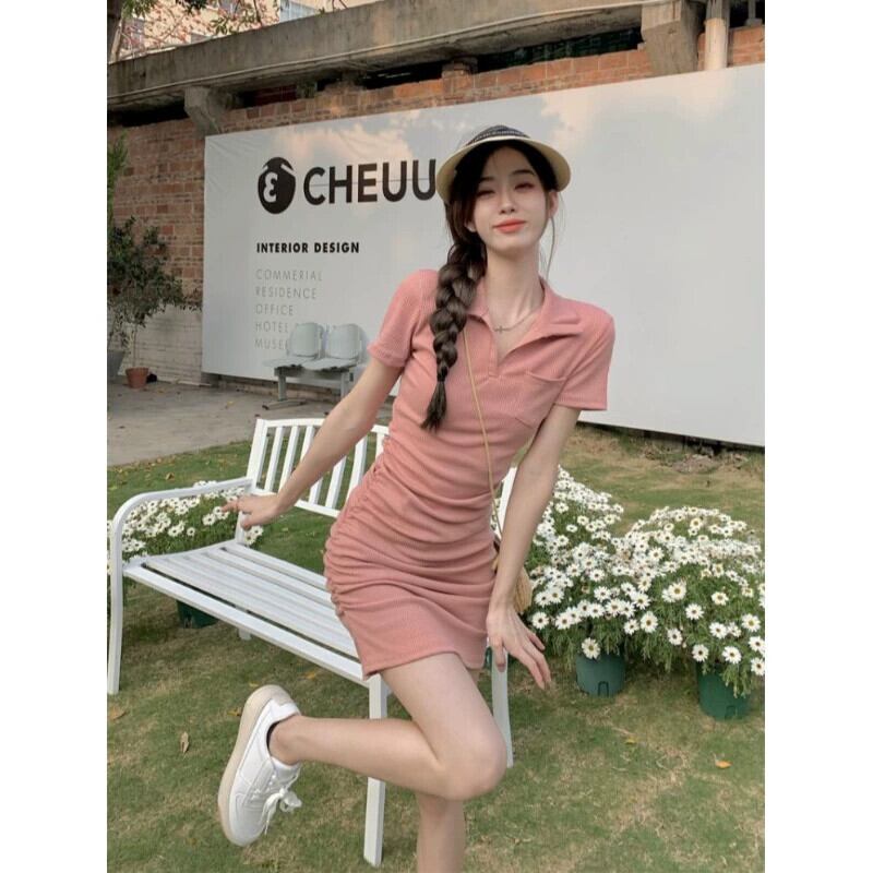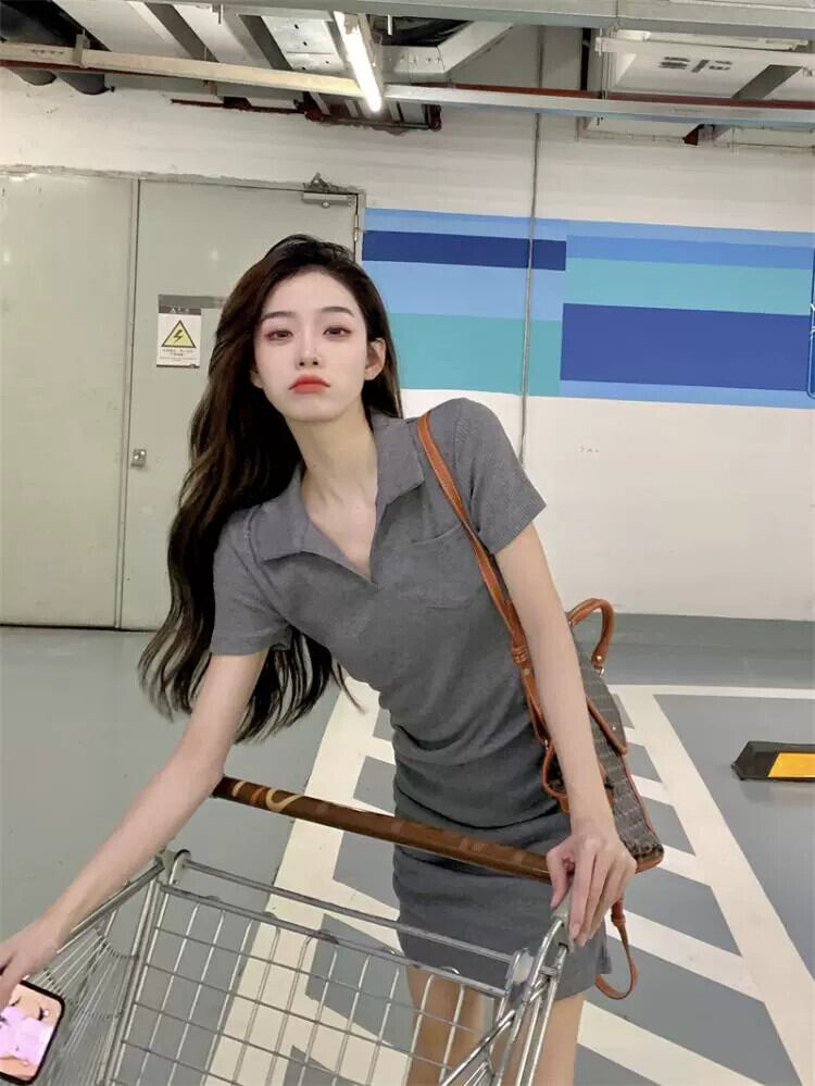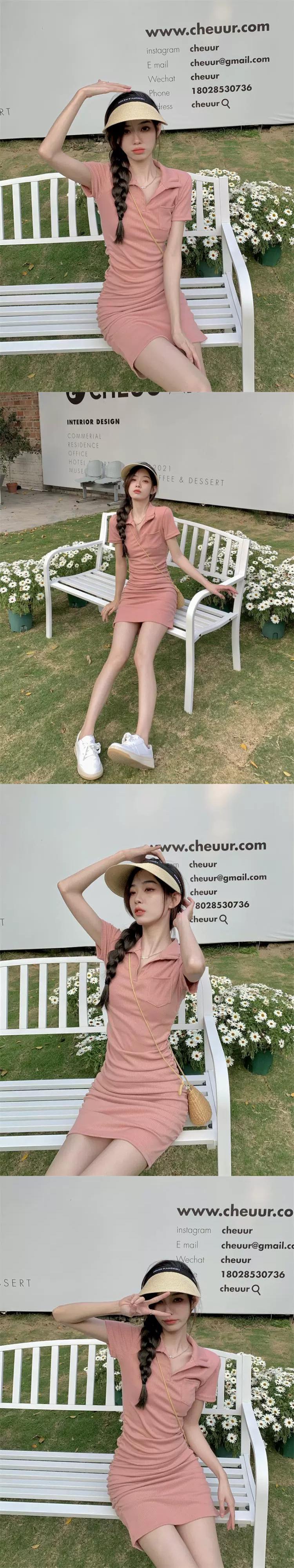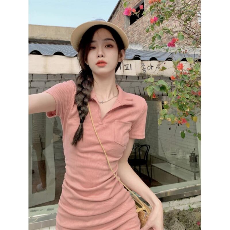ポロ襟プリーツニット半袖ドレス女性の夏の 2023 新しいウエスト痩身ボトミングバッグヒップスカート サマー 夏物 0921964320740434