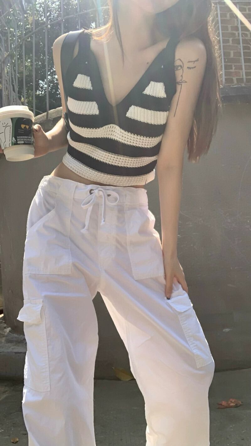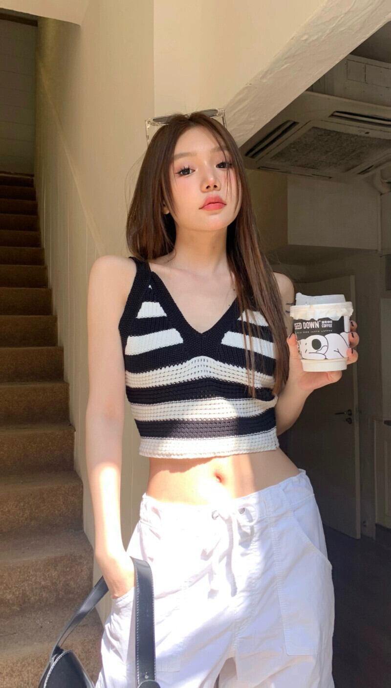 コントラストカラーストライプ V ネックキャミソール女性の夏 2023 新しいショートセクションスリムスリムボトムシャツトップ サマー 夏物 Vネック 0921953981321455
