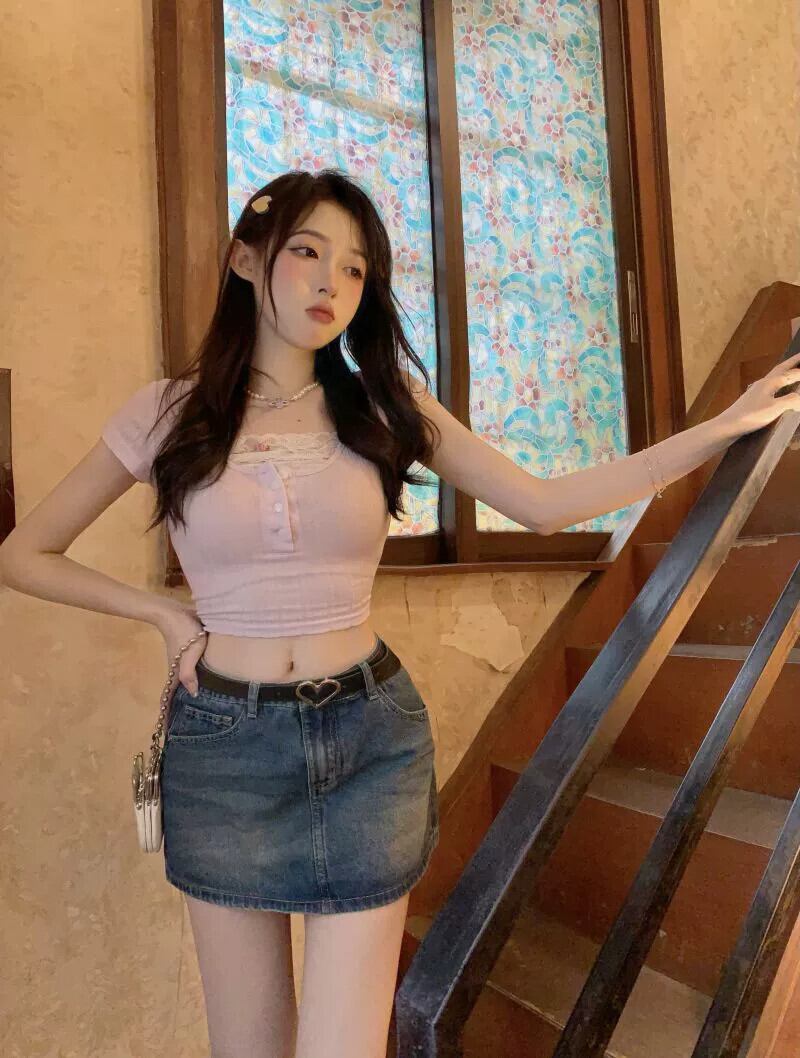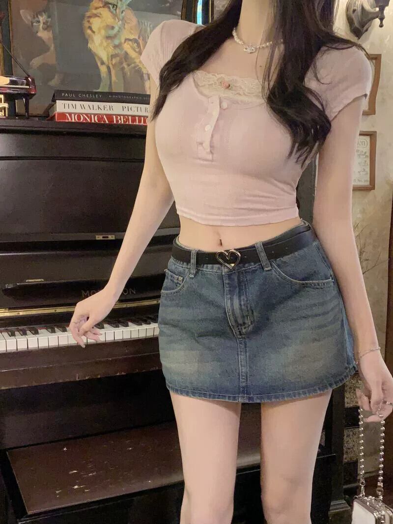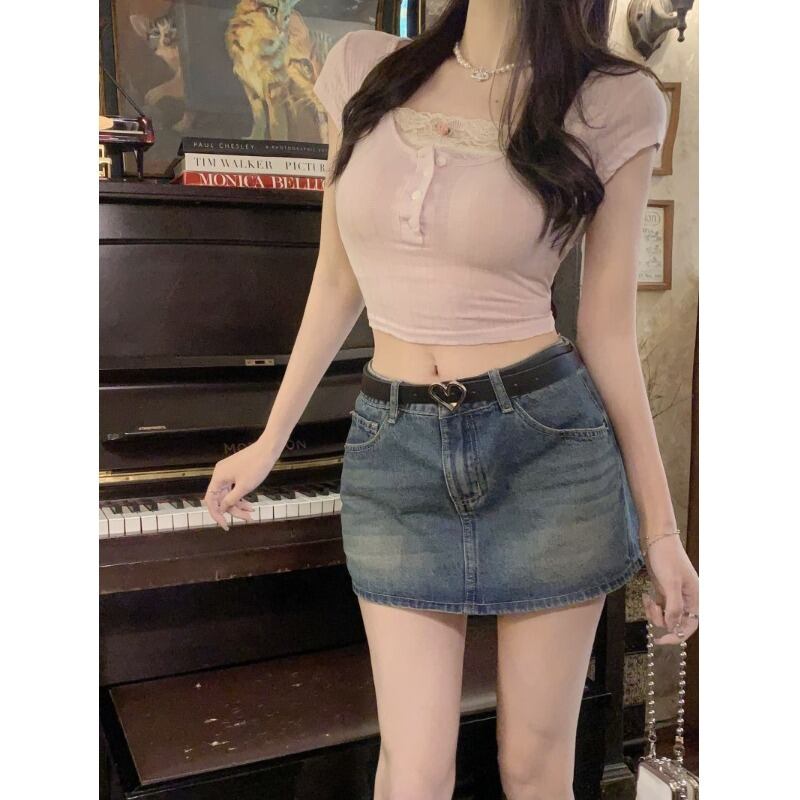 純粋な欲望のデザインセンスフェイクツーピース半袖 T シャツの女性の 2023 夏の新しいレースステッチショートセクションスリムトップトレンド サマー 夏物 Tシャツ 0921950601094146