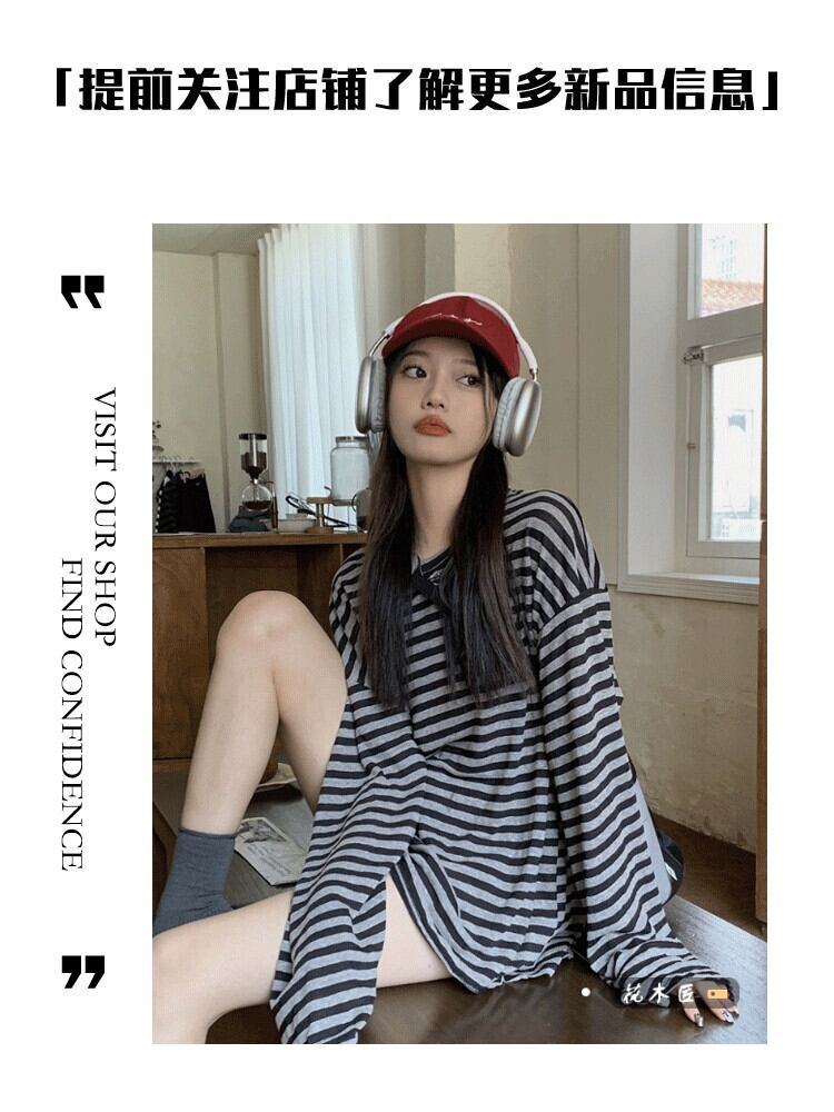センスニッチ ストライプ 長袖 Tシャツ レディース 2023 春新作 オールマッチ ミドル丈 ゆったり スリム トップス ロング スプリング 春物 0921944926231973
