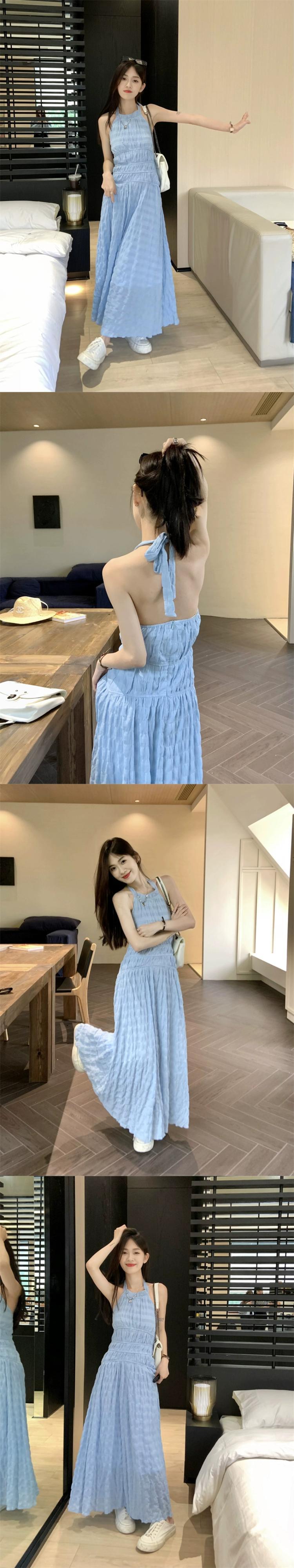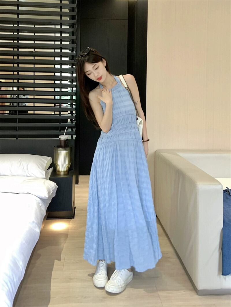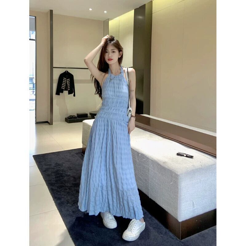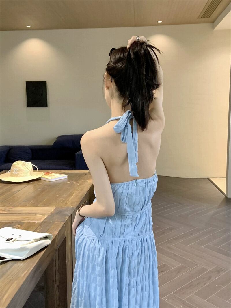 ホリデースタイル背中の開いたストラップホルターネックドレス女性の夏の2023新しい気質ウエスト痩身ブルーサスペンダースカート サマー 夏物 09219929617479