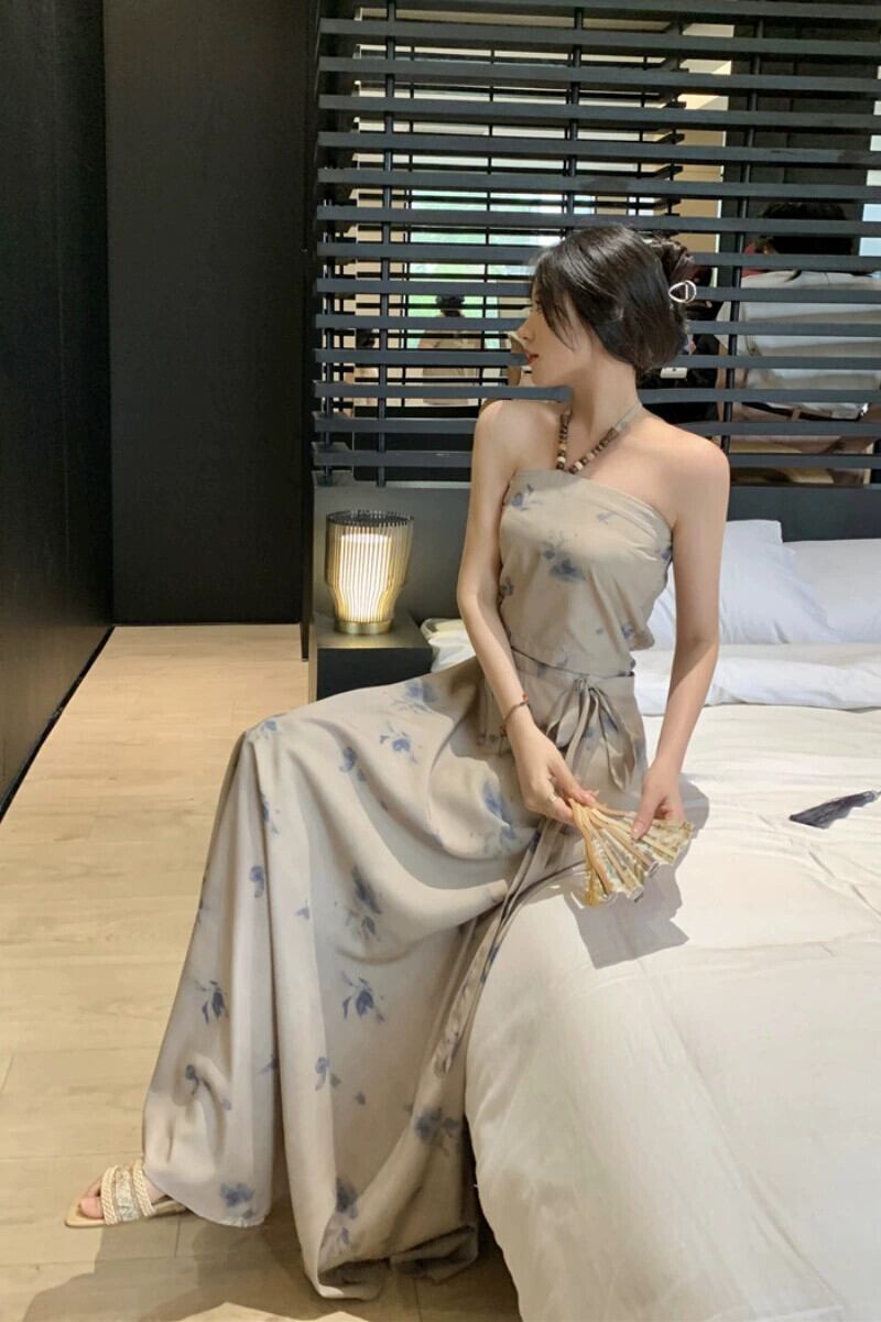 中国風国民風スーツ女性 2023 夏の新しい水墨画吊りネックストラップハイウエストスカート 2 点セット ハイウェスト サマー 夏物 0921990200308723