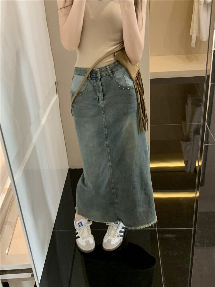 香港スタイルのレトロなブルーデニムスカートの女性の夏のハイウエストミッドレングススカート、古いローエッジデザインセンスのAラインスカート ハイウェスト サマー 夏物 0921922207497797