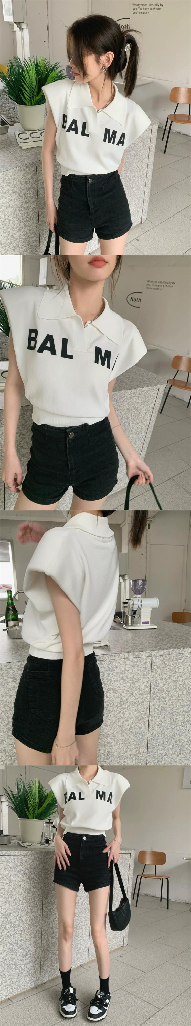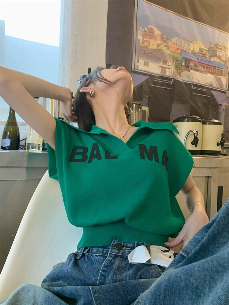 デザインセンスレタープリントニットラペル Tシャツ女性の夏の 2023 新しいショートセクションスリムノースリーブトップ サマー 夏物 0921961775560859