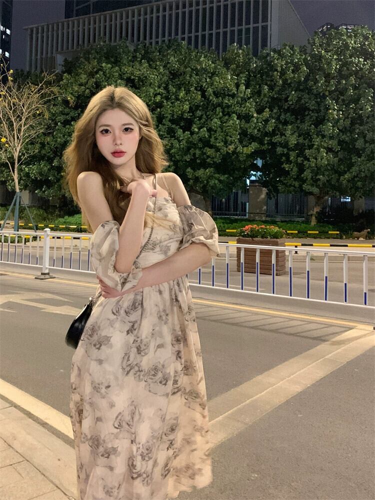 優しいローズ花柄半袖チューブトップドレス女性の夏のフランスの純粋な欲望ワンショルダーミッドレングススカート気質スカート サマー 夏物 ピュア 0921934735559397